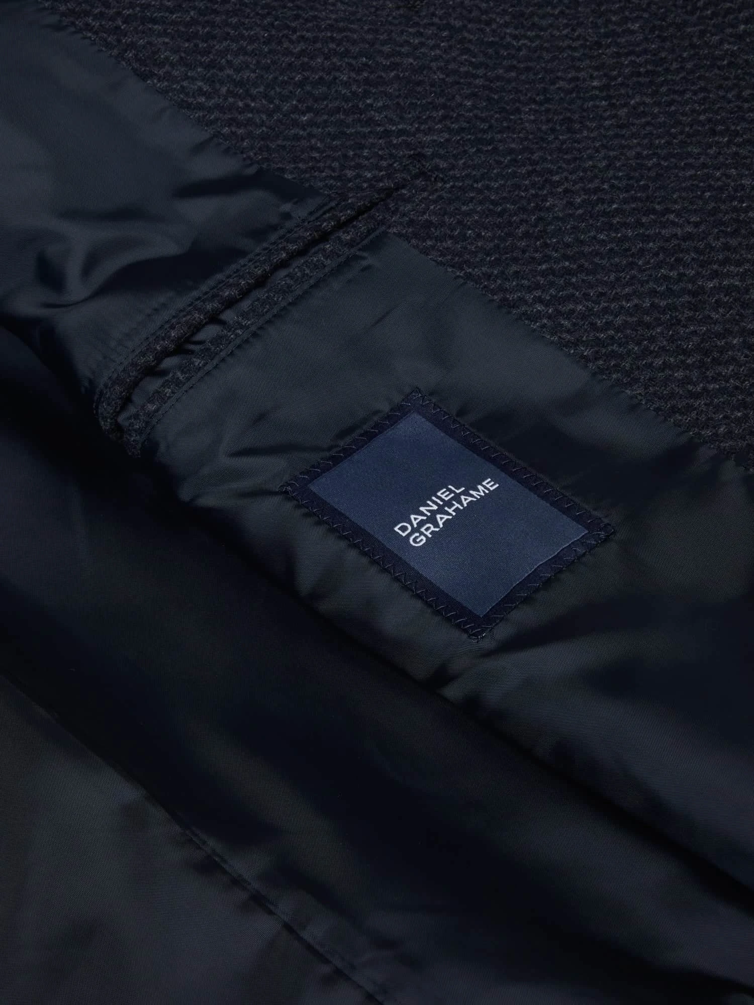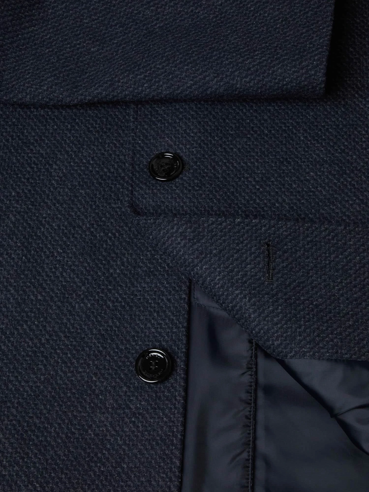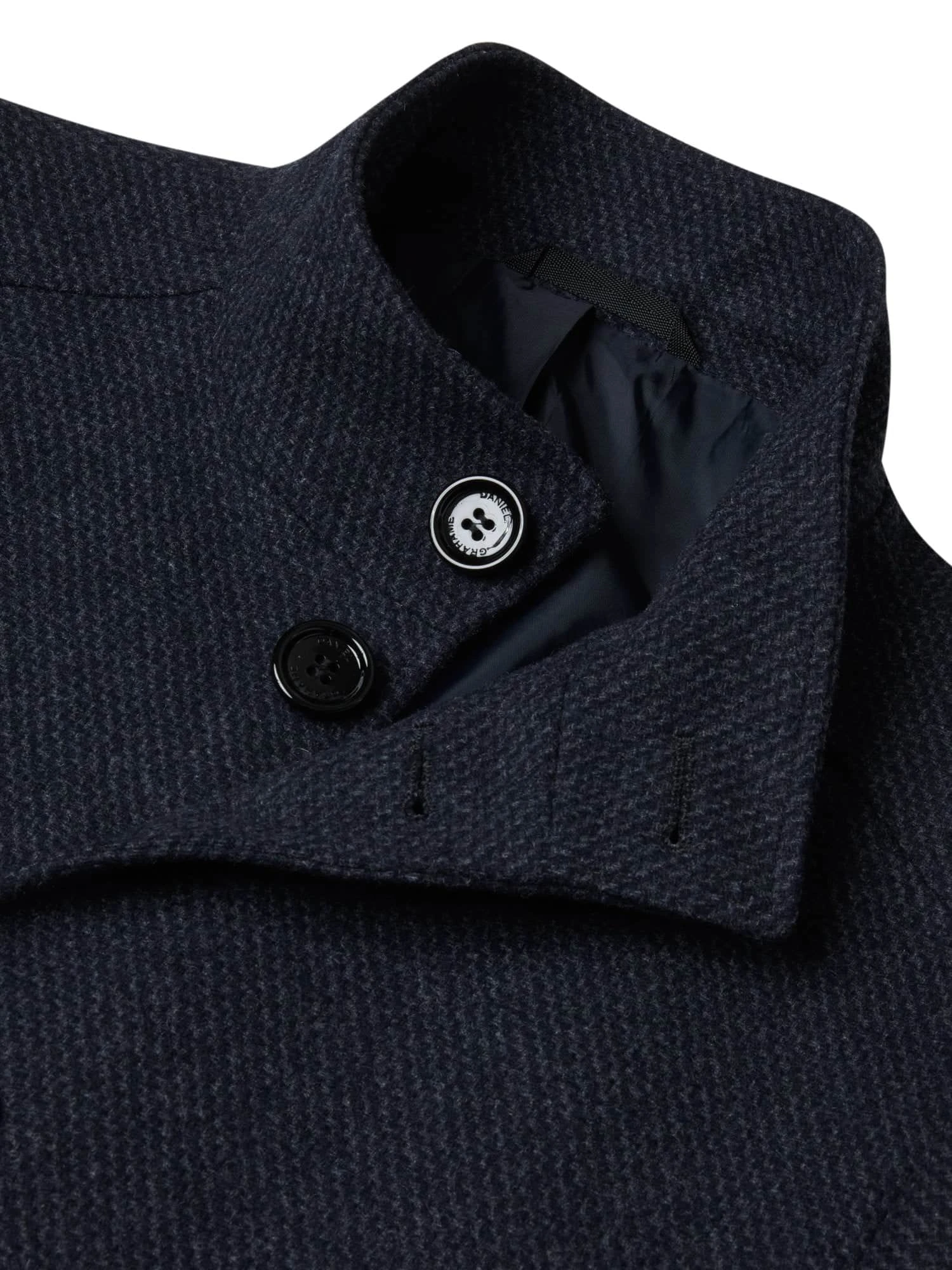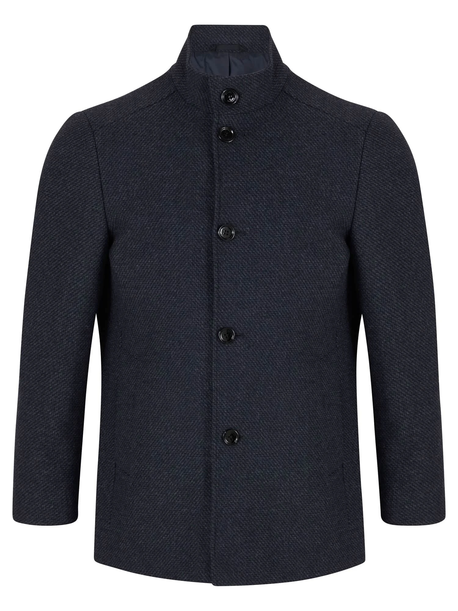 The Daniel Grahame 4-90206-28 Watson Dark Blue Wool Blend Tailored Coat is a stylish piece made from a warm wool blend. It features a tasteful high collar and a smart button front design, perfect for bringing a touch of sophistication to any outfit.
