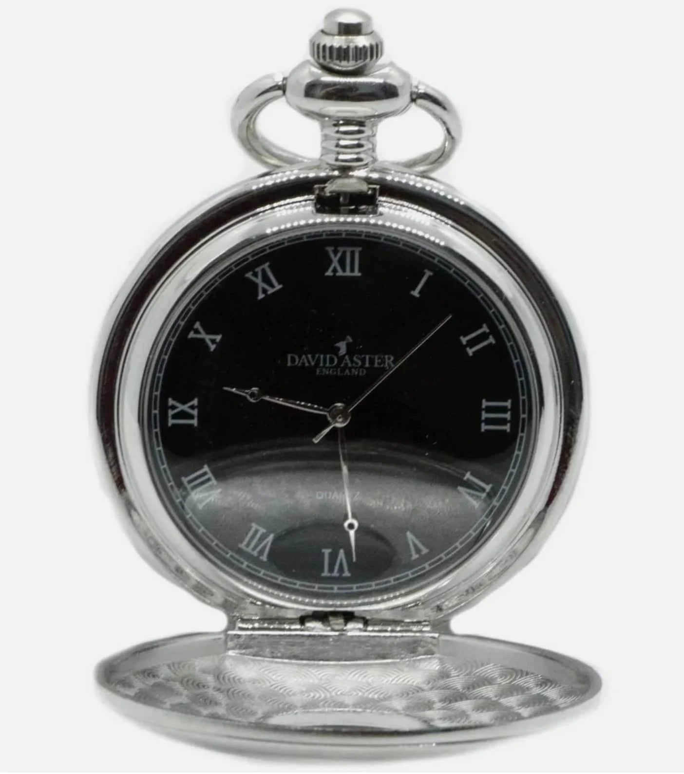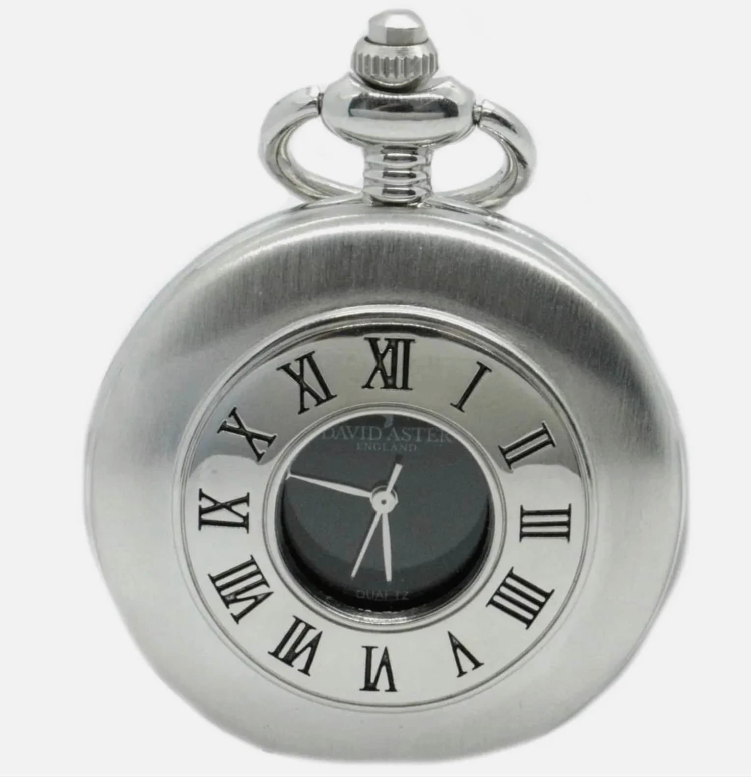 The David Aster Mens Quartz Half Hunter Pocket Watch – Silver/Black is made from 100% Zinc Alloy. The Silver/Black watch comes Complete in a gift box. The men’s zinc watch make great gifts. Buy the David Aster Mens Quartz Half Hunter Pocket Watch – Silver/Black now.
