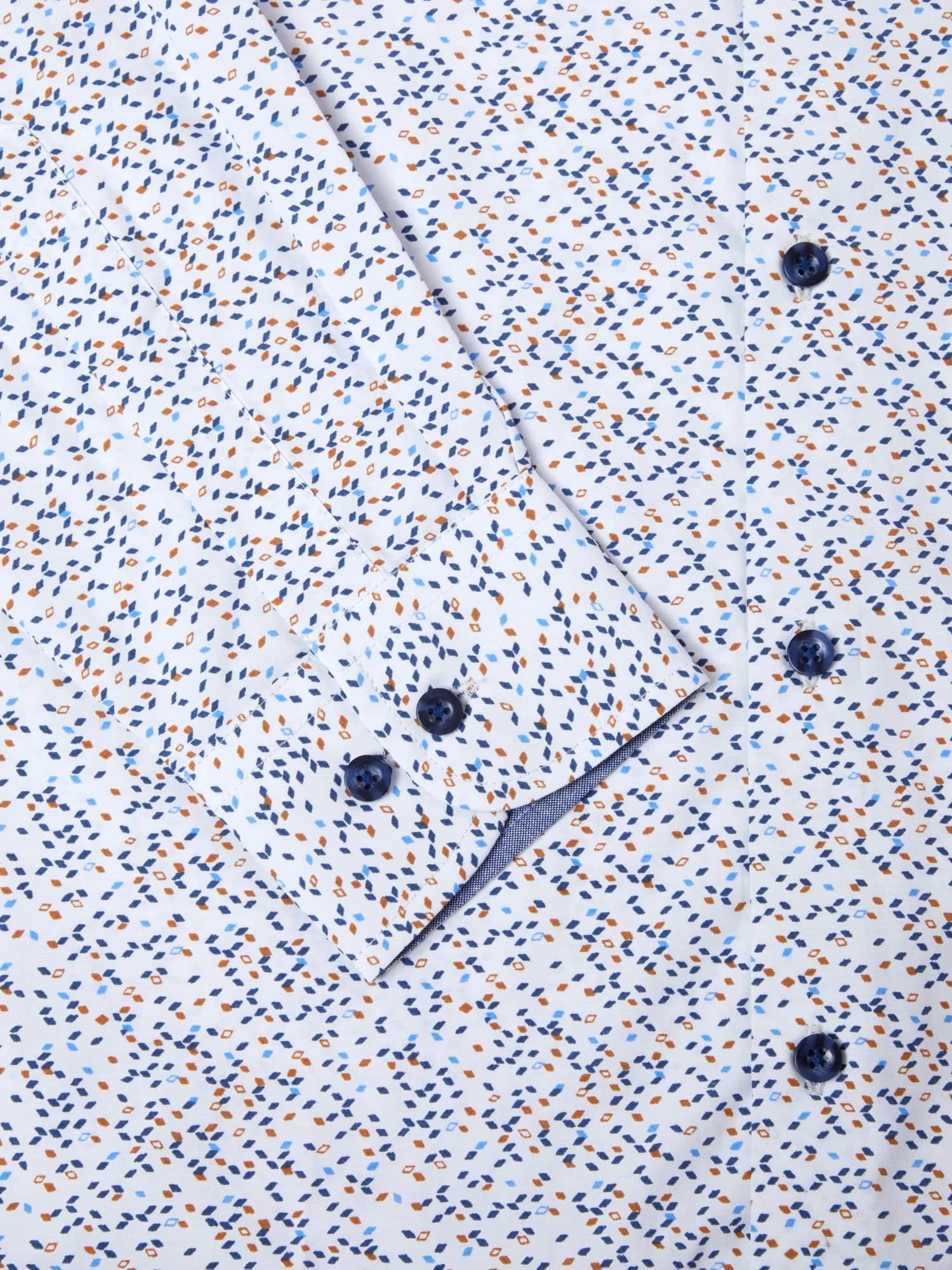 Featuring a button-down collar and navy buttons, it adds a touch of sophistication to the overall look. The subtle diamond print in navy enhances its smart-casual appeal, making it an ideal choice for both formal and laid-back occasions. Perfect for pairing with jeans or trousers, this shirt brings versatility and style to your wardrobe.