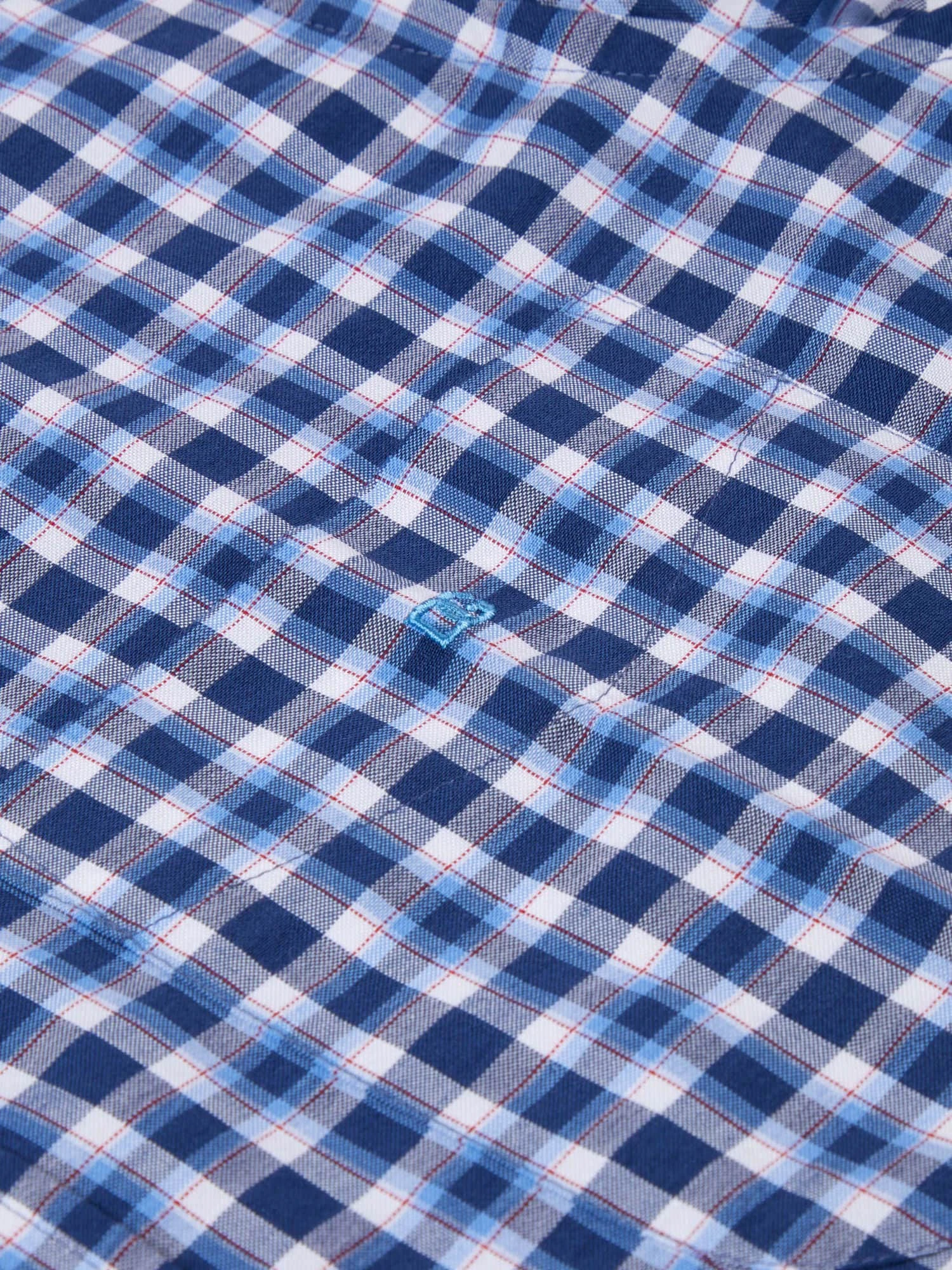 Featuring a button-down collar and navy buttons, it adds a touch of sophistication to the overall look. The subtle diamond print in navy enhances its smart-casual appeal, making it an ideal choice for both formal and laid-back occasions. Perfect for pairing with jeans or trousers, this shirt brings versatility and style to your wardrobe.
