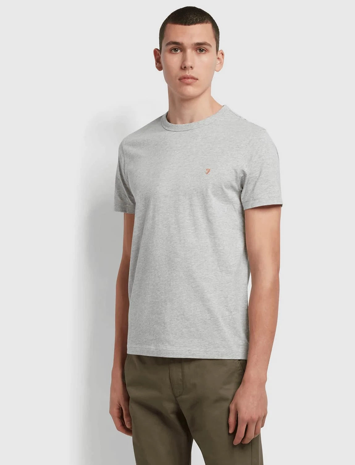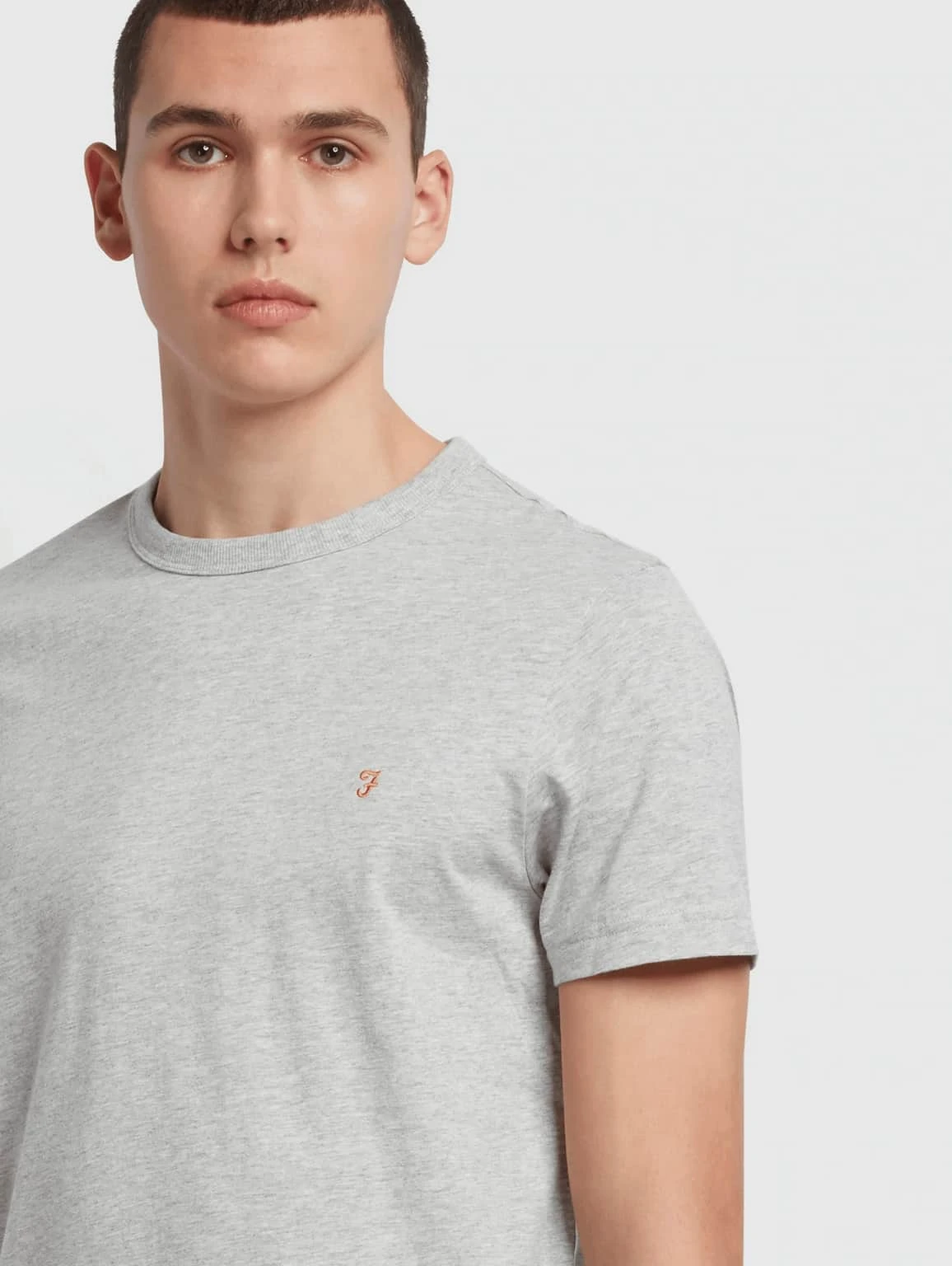 Farah Vintage Danny Short Sleeve T Shirt In Blue, A cotton jersey t shirt with a ribbed crew neck and short sleeves. The signature embroidered Farah Vintage logo is situated on the left of the chest in golden yellow. Top stitching in blue. 100% Cotton.