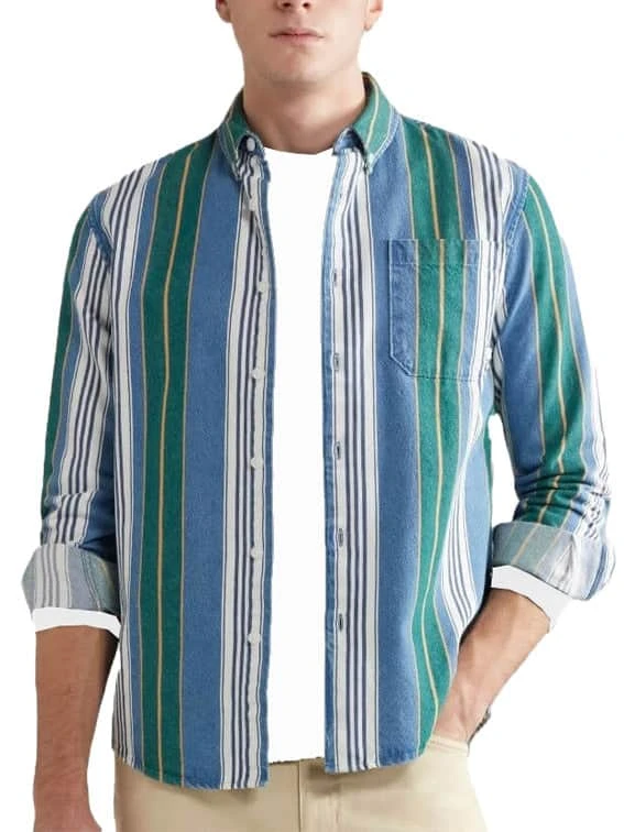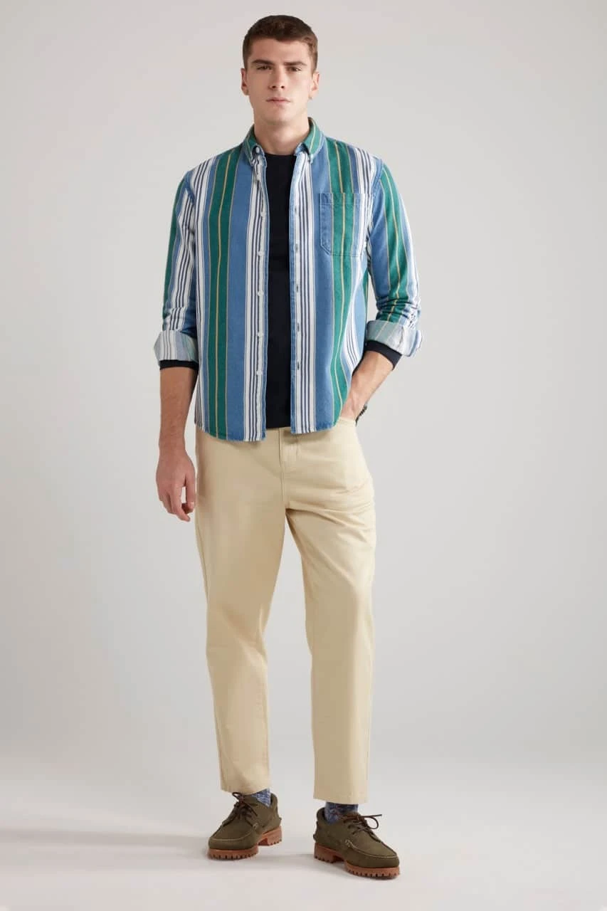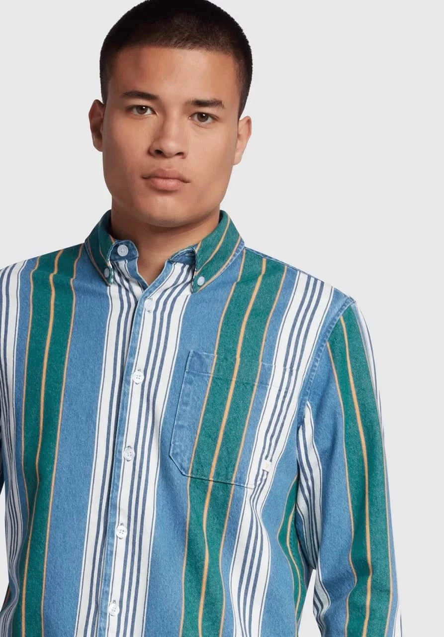 Featuring a relaxed, casual fit, complete with long sleeves and a handy chest pocket, it effortlessly blends comfort with functionality. The intricate stripes in a rich dark ocean green hue lend an air of sophistication to your ensemble, making it the perfect choice for days when you desire a polished look without sacrificing comfort.
