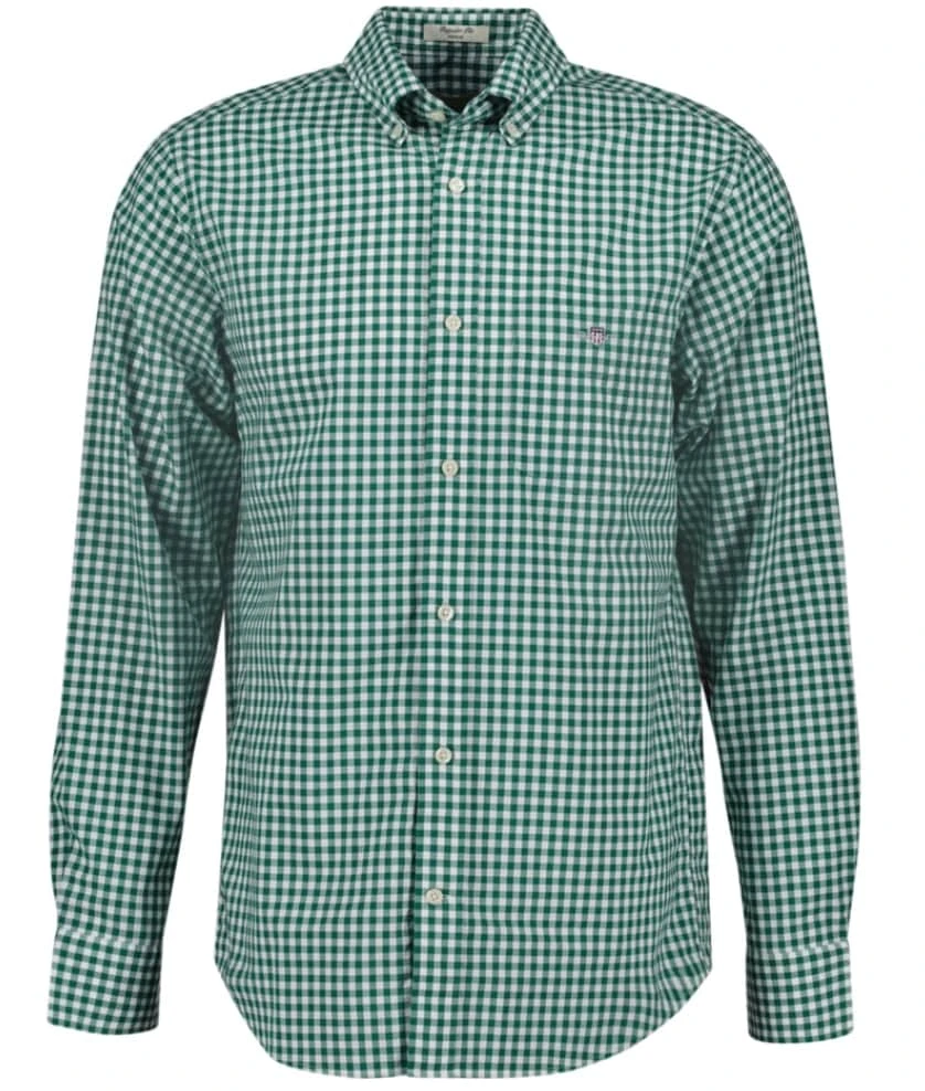 Elevate your shirt collection with our Gingham Poplin Shirt. Designed for a comfortable, regular fit, it features our GANT shield graphic on the chest pocket, adding a touch of timeless style to any business-casual outfit.