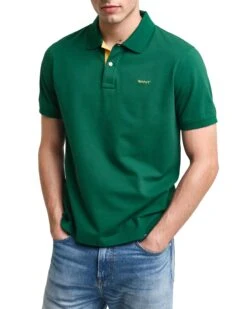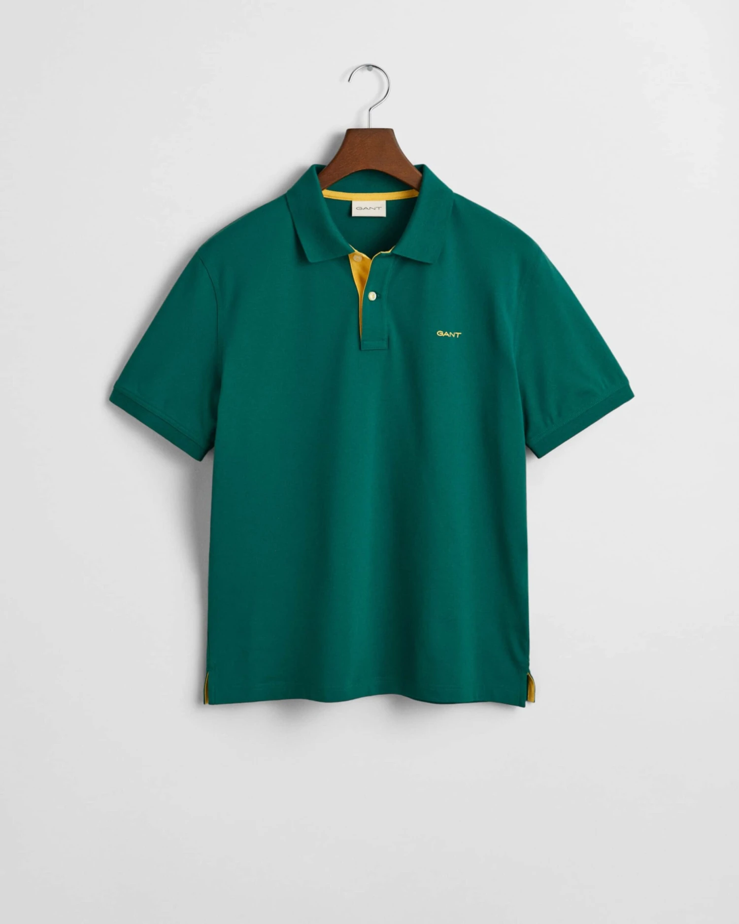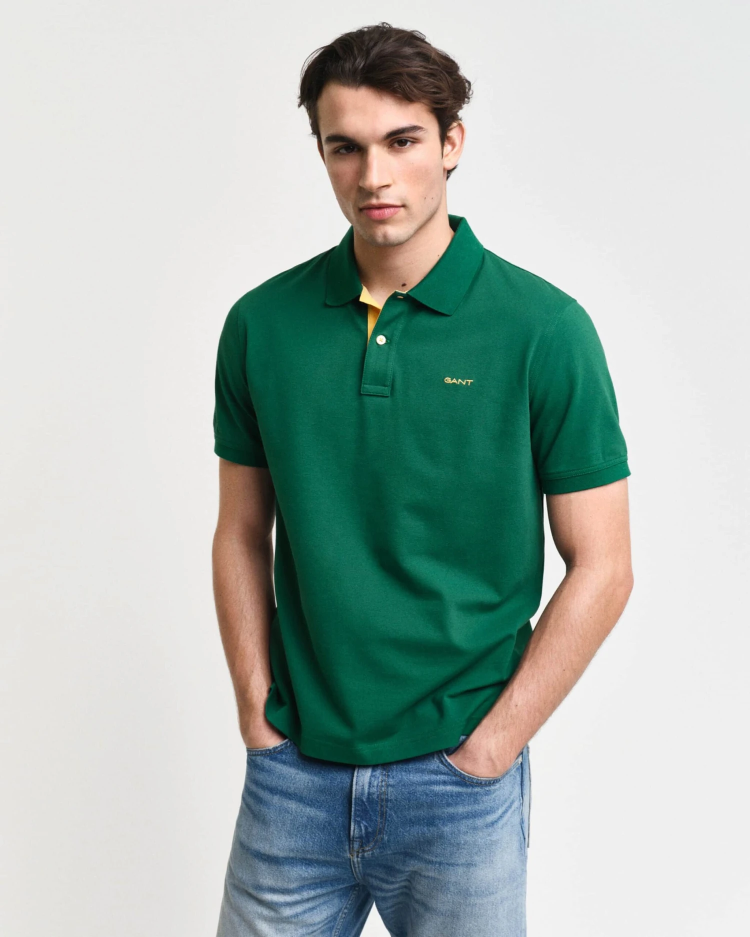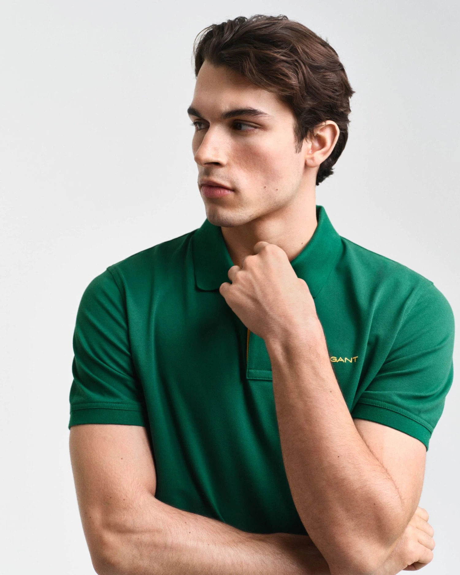 Now available at Kelvin Graham Menswear, this polo shirt is crafted from cotton with a touch of stretch for added comfort. It features contrast-colored GANT embroidery on the chest, adding a stylish detail.