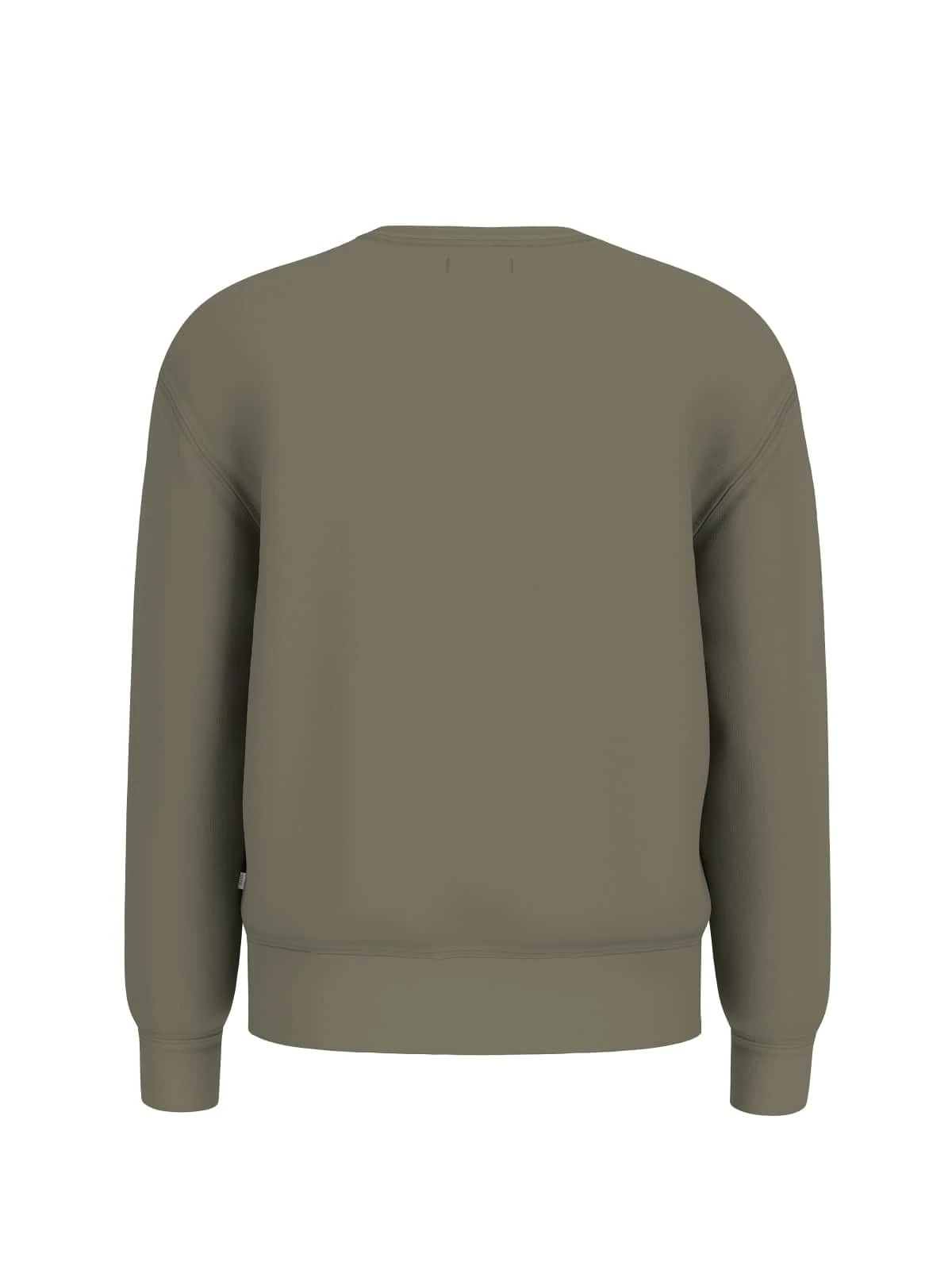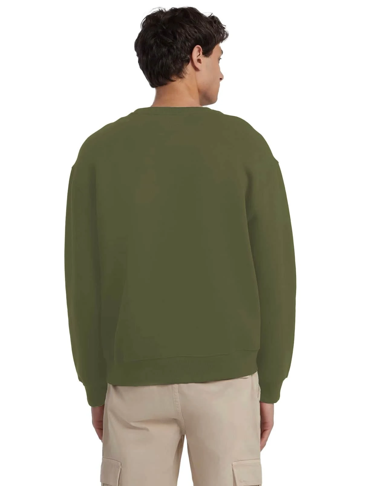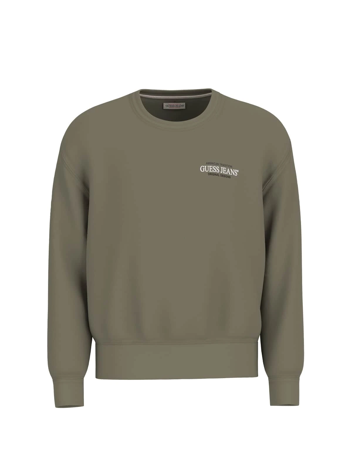 The GUESS JEANS Men’s Regular American Tradition Crew Neck Sweatshirt in Olive is a timeless addition to your wardrobe. This classic-fitting pullover is crafted from an organic cotton blend, offering both comfort and sustainability.