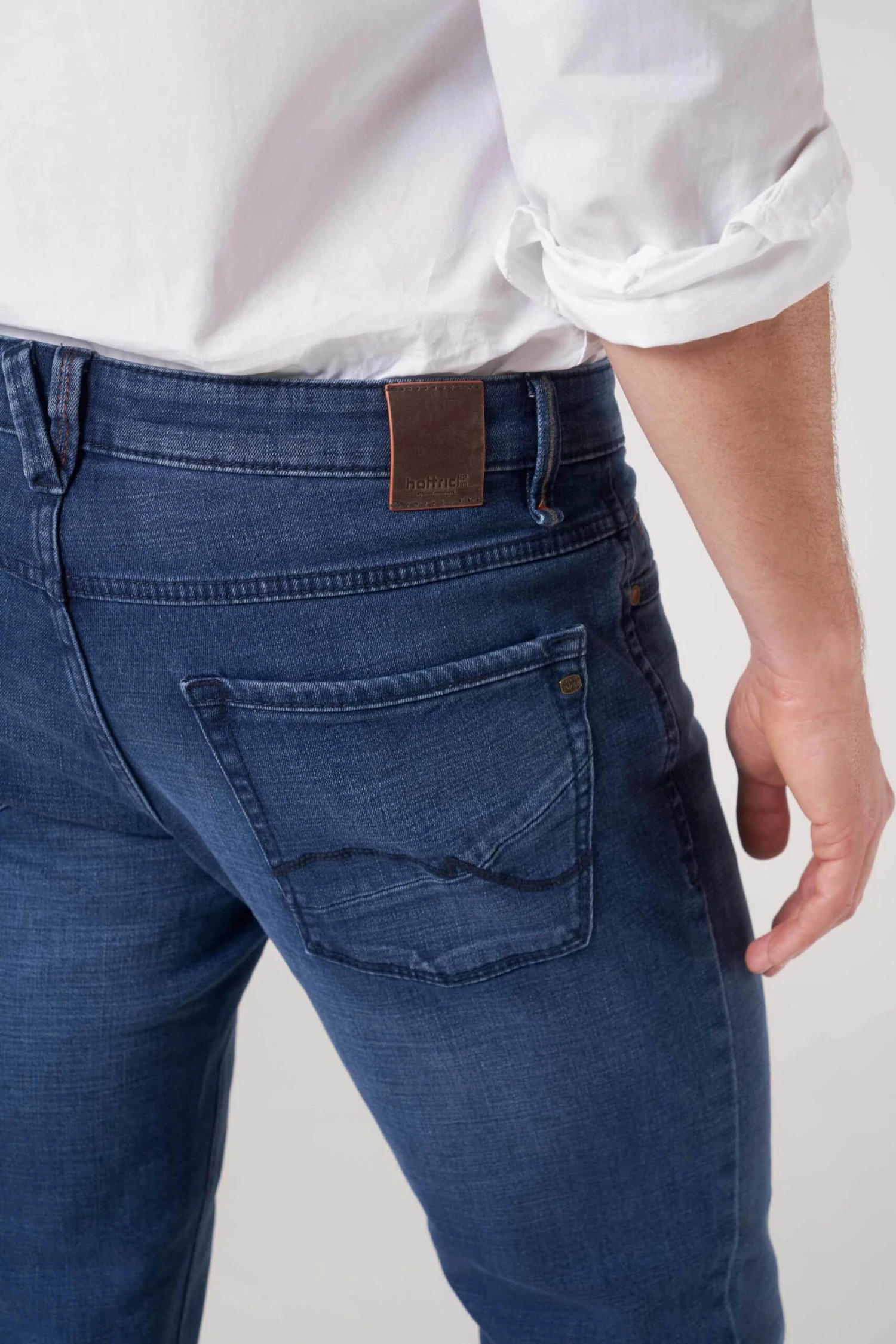 The modern 5-pocket jeans Harris in new mid-blue offers both style and comfort. Its design features front 5-pocket pockets with an additional coin pocket and back pockets adorned with embroidery, adding a touch of detail to the garment. Crafted from cross hatch denim, this pair of jeans is not only stylish but also durable and easy to maintain. The stretch fabric ensures exceptional comfort and freedom of movement, despite its slim silhouette.