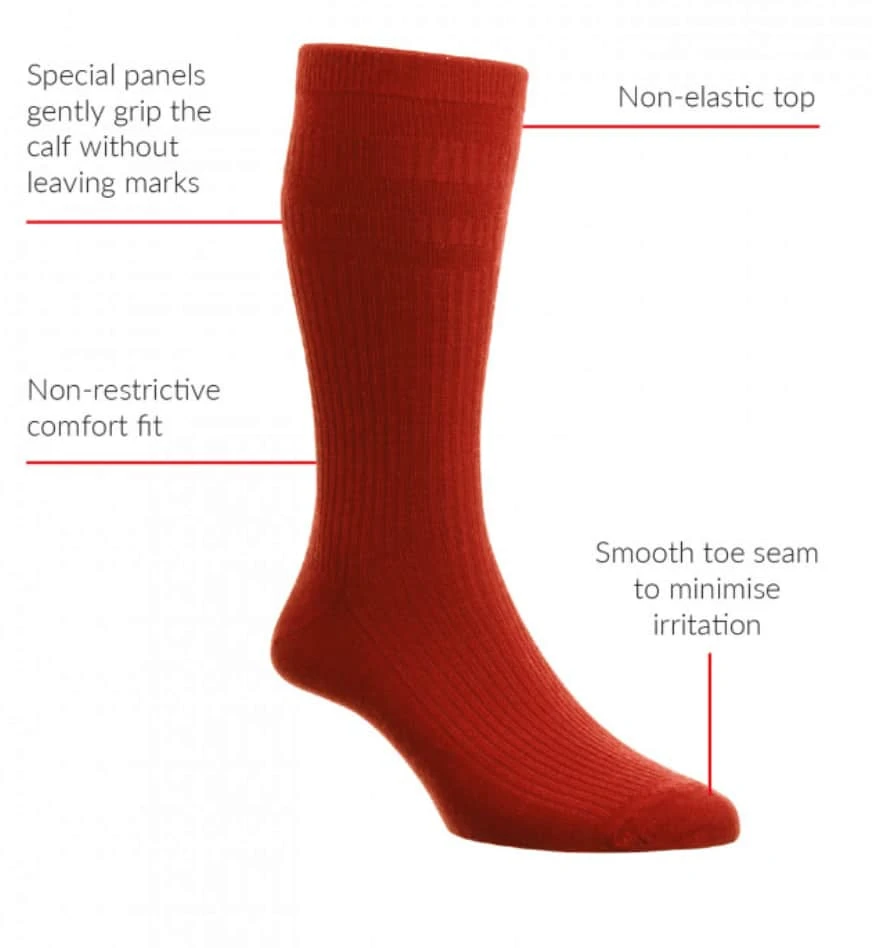 Non-Elastic Top – has 3 unique relaxation panels (the ‘soft top’ that makes them soft top socks) that contract vertically and stay up all day without leaving marks on the legs or restricting circulation
