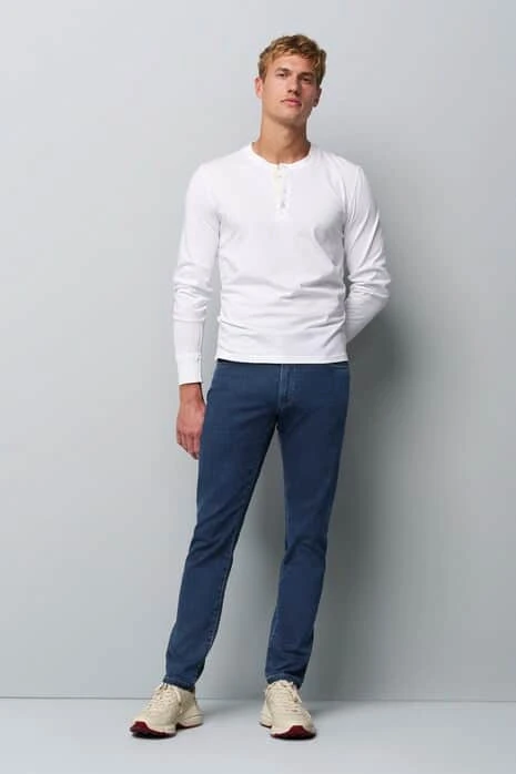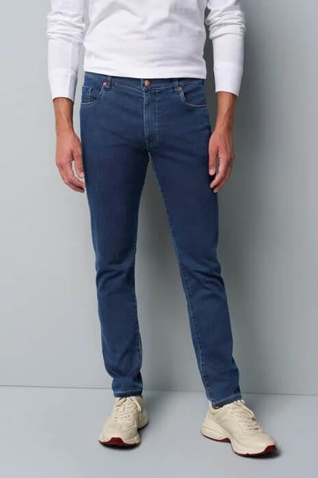 This denim, crafted from pleasantly soft organic cotton, stands out with its vibrant multicolored stitching. The dark fabric beautifully highlights this playful detail. With a slim fit and individually hand-applied special effects, these jeans effortlessly elevate both business and casual looks. The super-stretch fabric ensures maximum freedom of movement and top-notch comfort. Featuring a carefully designed contoured waistband, a practical coin pocket, and a colorful woven lining, these are authentic M|5 trousers. Made with 100% climate neutrality, they are produced FAIRLY and responsibly in MEYER’s own European facilities.