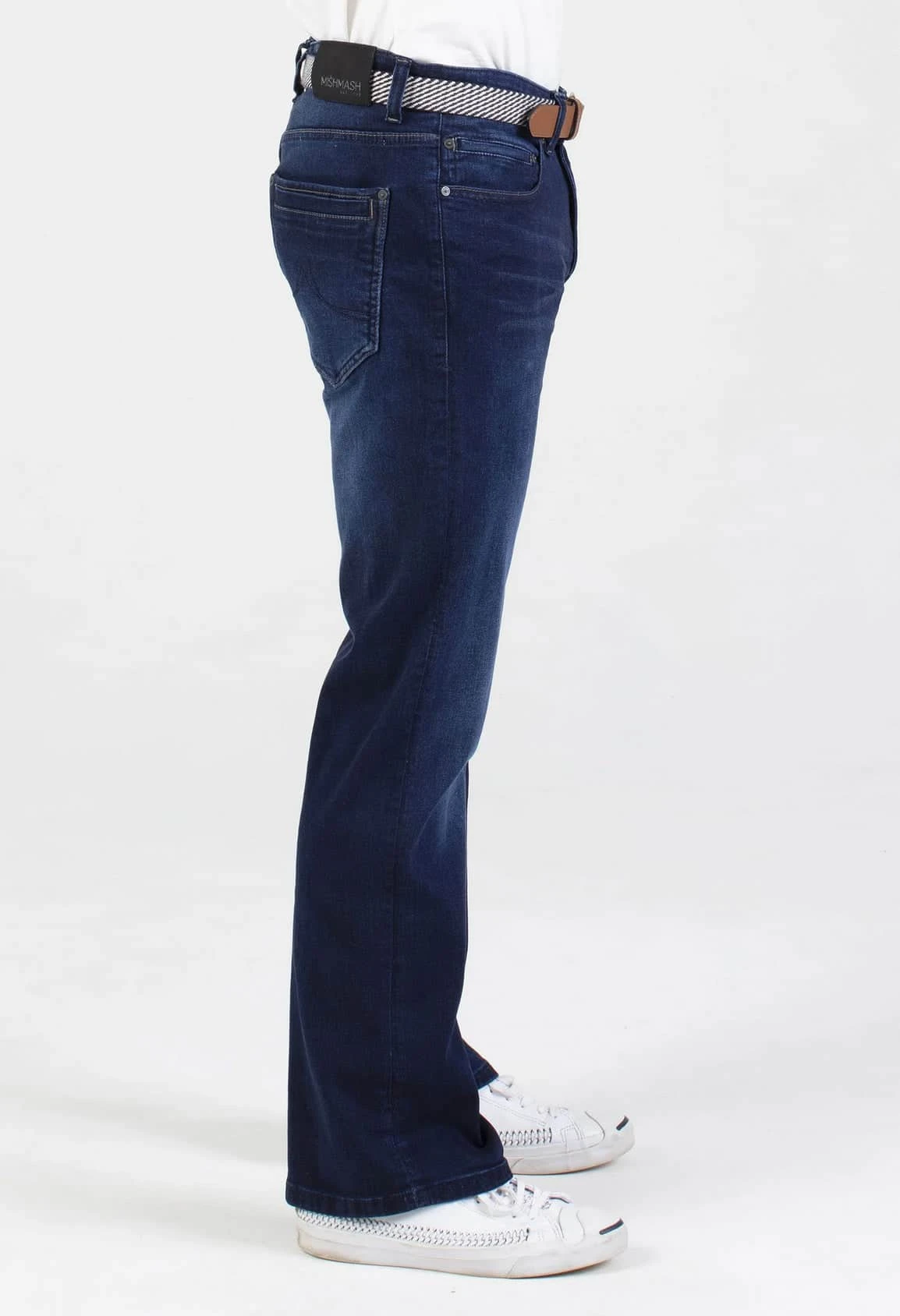 This jean has been washed to a dark blue tone with contrasting abrasions and wear marks. The hand finished wash effects add a faded-blue contrast that gives the jeans a depth of high and lows within the indigo, completed with subtle 3D creases. Stitching to compliment the denim shade.