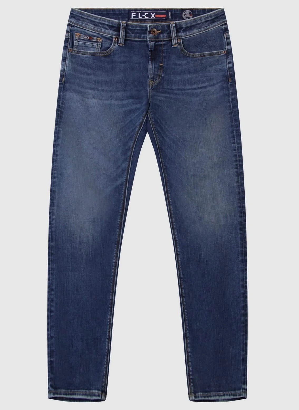 This pair of jeans features a mid-blue wash, accentuated with distinctive abrasions and wear marks for a striking contrast. The hand-finished wash process introduces faded-blue nuances, lending the denim a captivating interplay of highs and lows within the indigo spectrum, enhanced by subtle 3D creases. The stitching is thoughtfully matched to complement the denim’s shade.