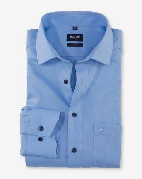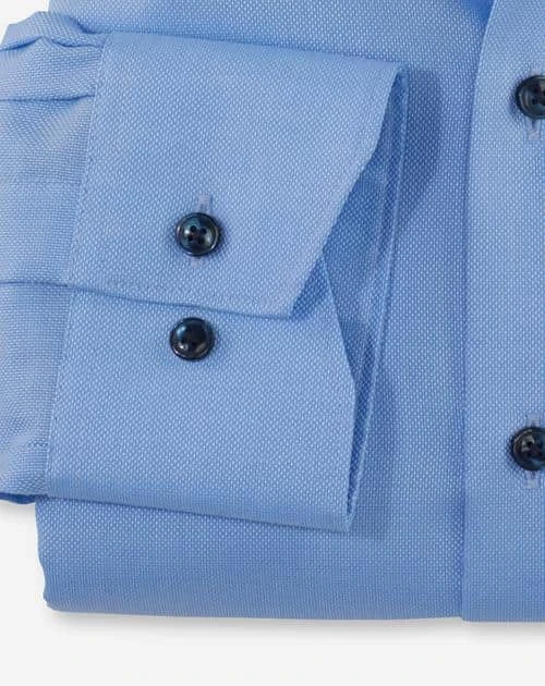 The fashionable blue OLYMP Luxor modern fit GREEN CHOICE shirt impresses with its high-quality cotton and luxurious wearing comfort. The integrated trimmings in the collar and the cuffs skilfully upgrade the shirt together with the light structure.