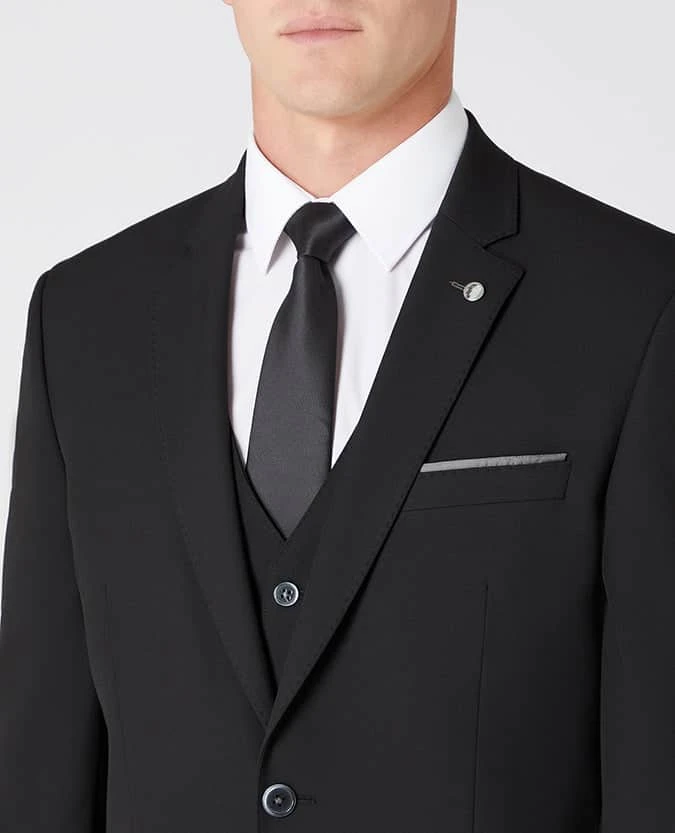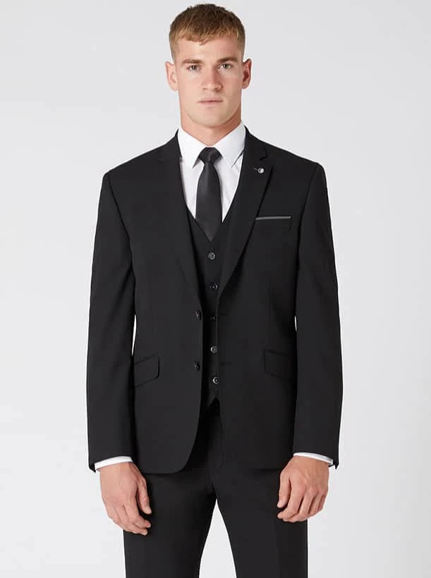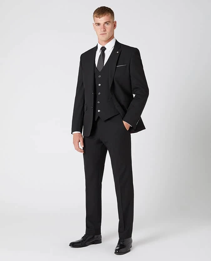 Black tapered fit stretch mix and match suit. Single-breasted button two jacket with slim notched lapels, side vents and straight flap side pockets.