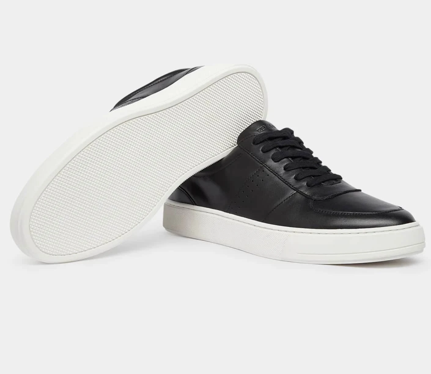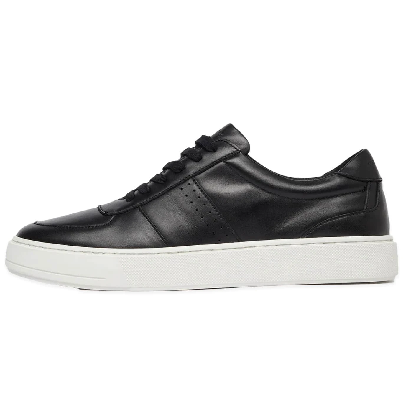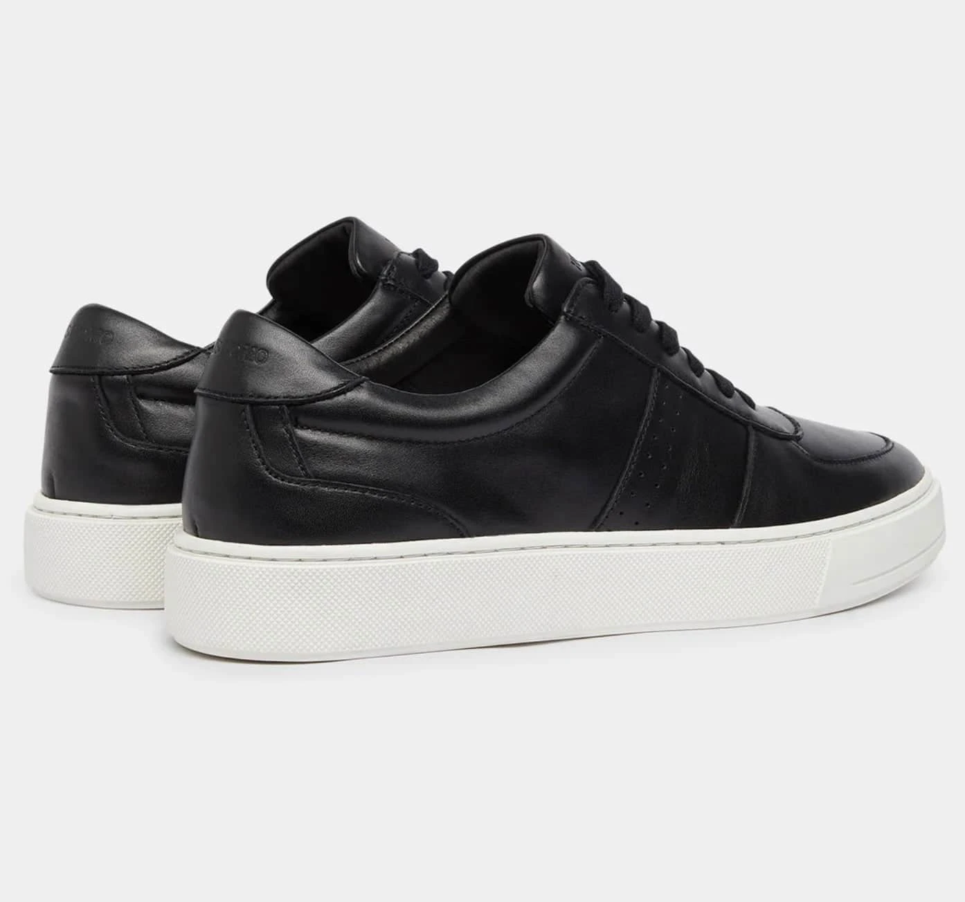 Black leather cupsole trainer with white rubber sole. Closing lacing with 6 eyelets. Leather upper with punch hole and seam detail. Graduated cupsole and branded heel tab and tongue.