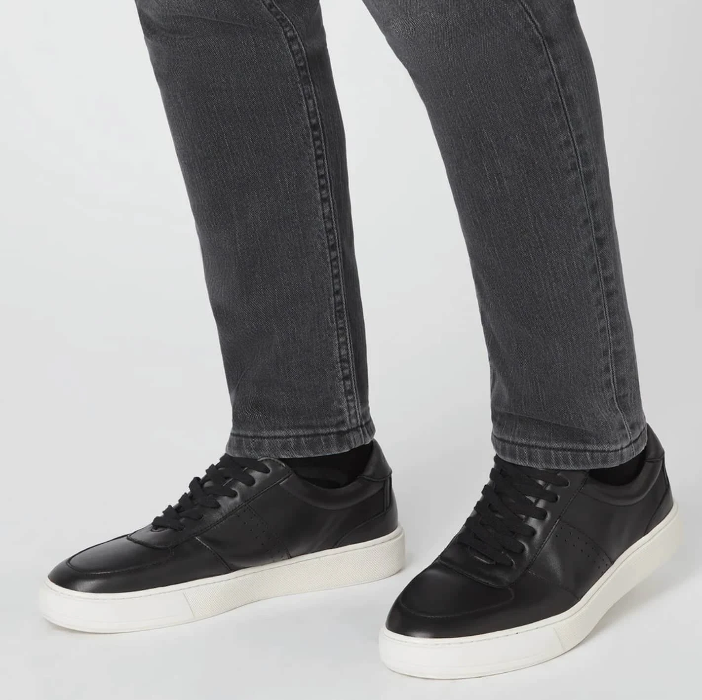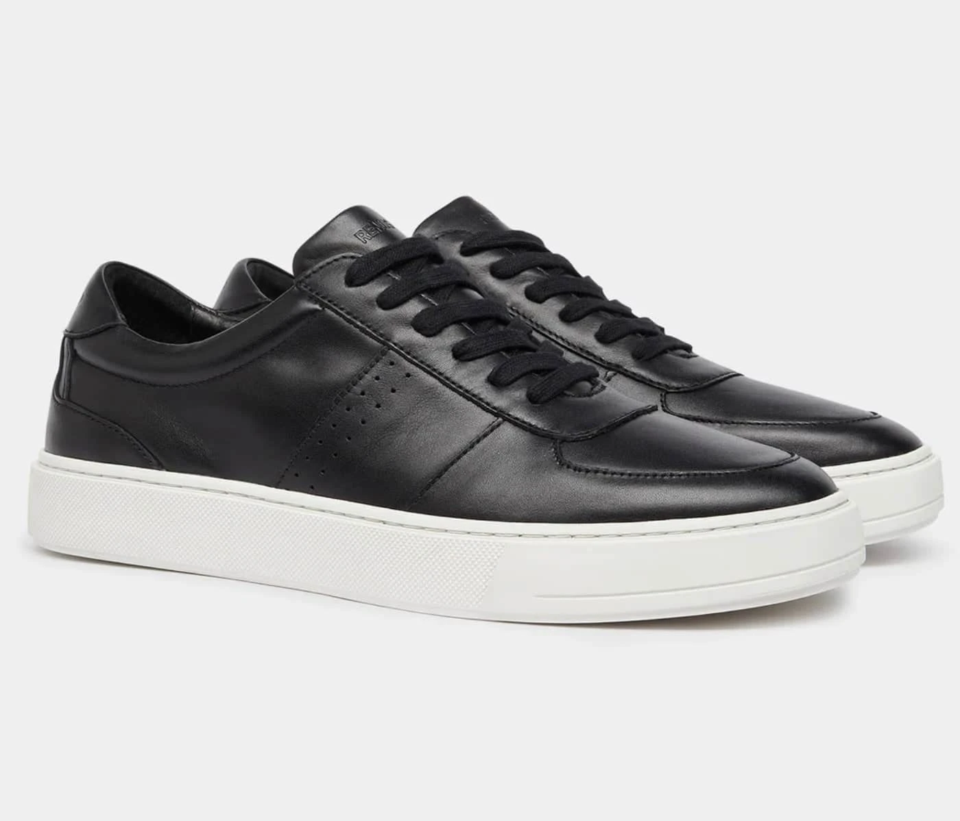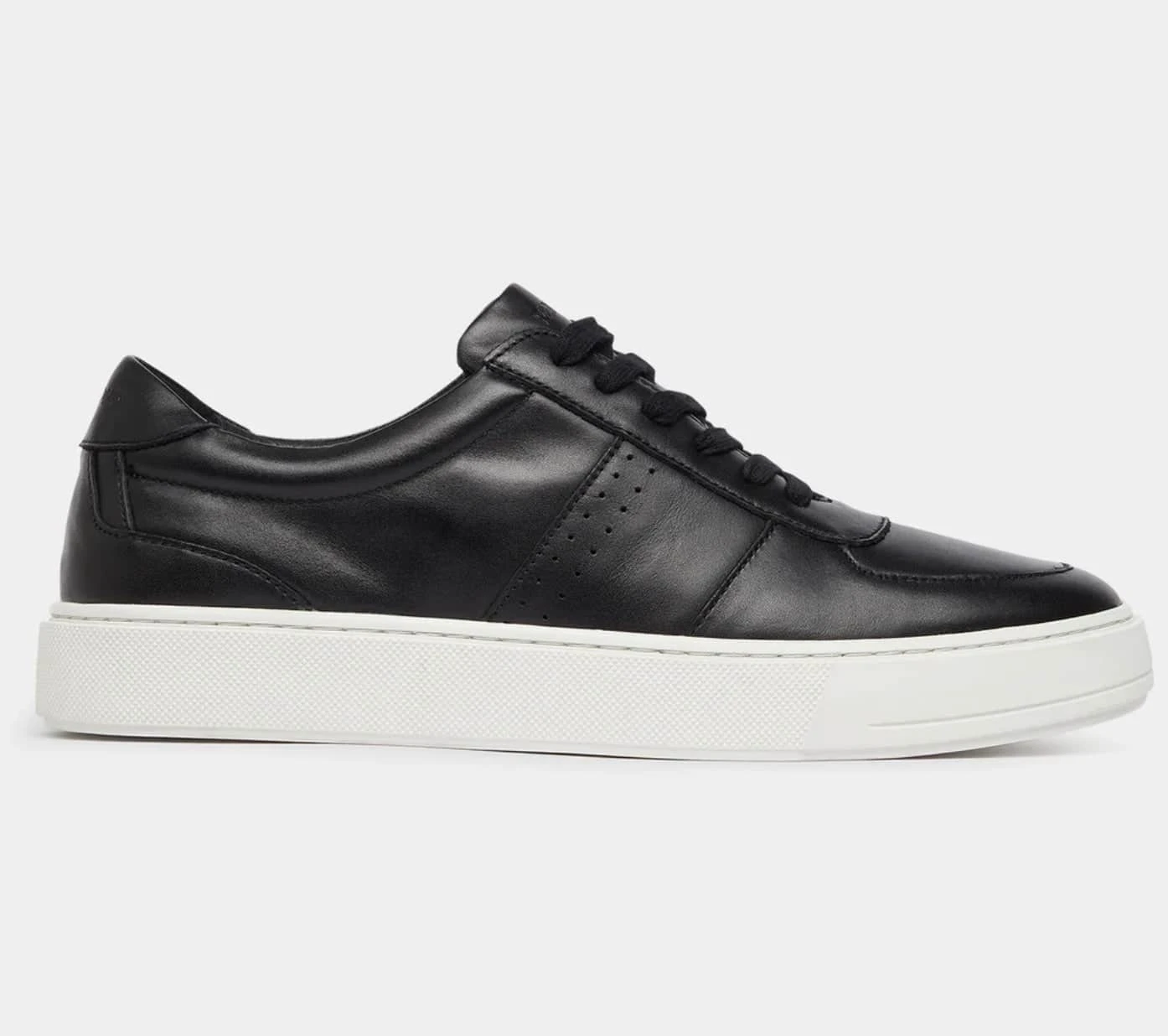 Black leather cupsole trainer with white rubber sole. Closing lacing with 6 eyelets. Leather upper with punch hole and seam detail. Graduated cupsole and branded heel tab and tongue.