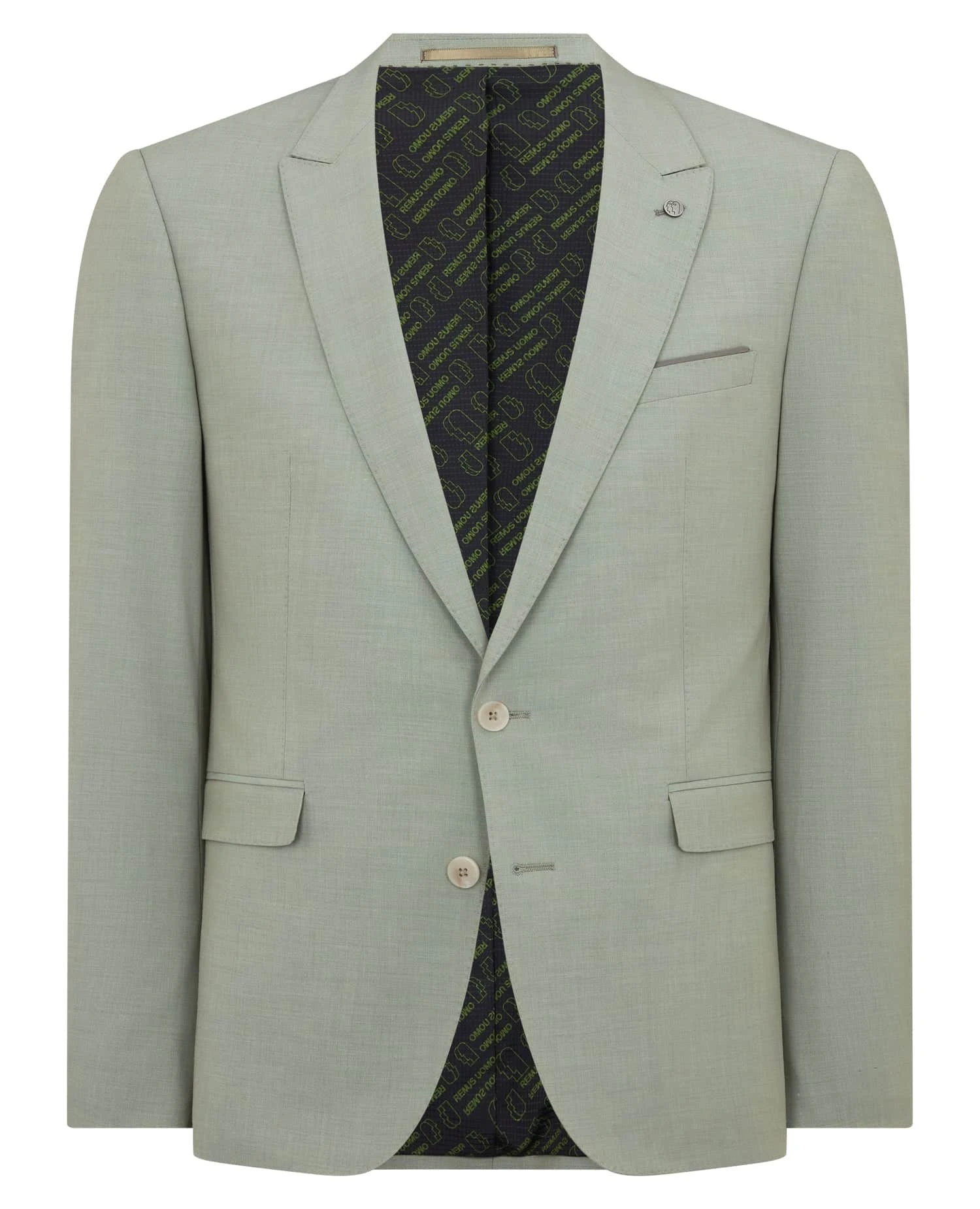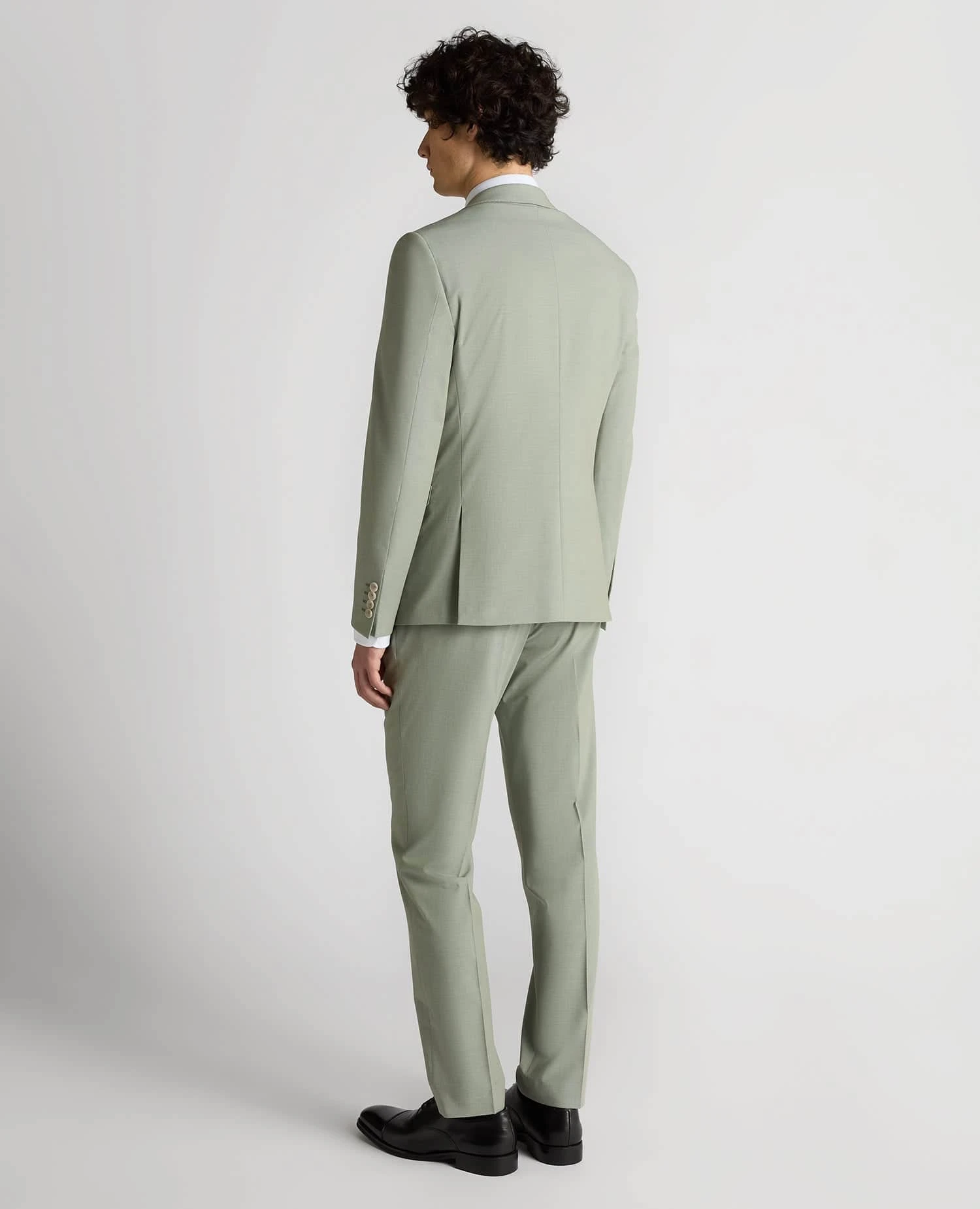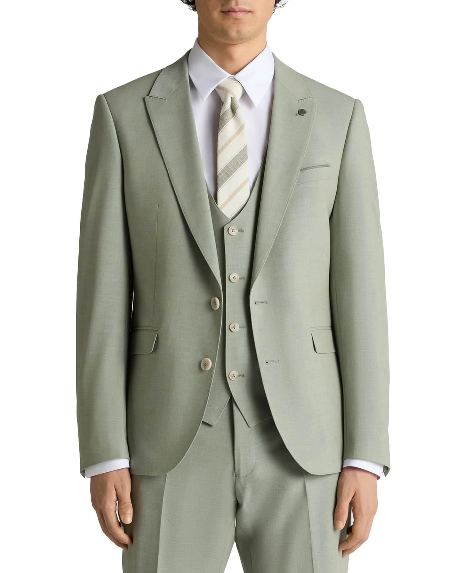 Light green slim fit stretch suit. Wide peak lapel, two button close, straight flap side pockets and jetted ticket pocket on chest. This material offers a linen look whilst having the comfort of stretch.