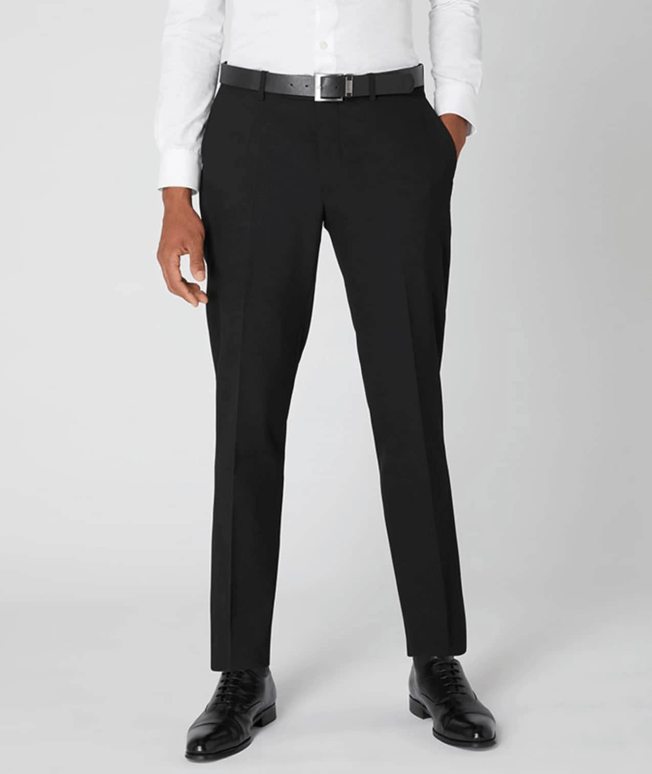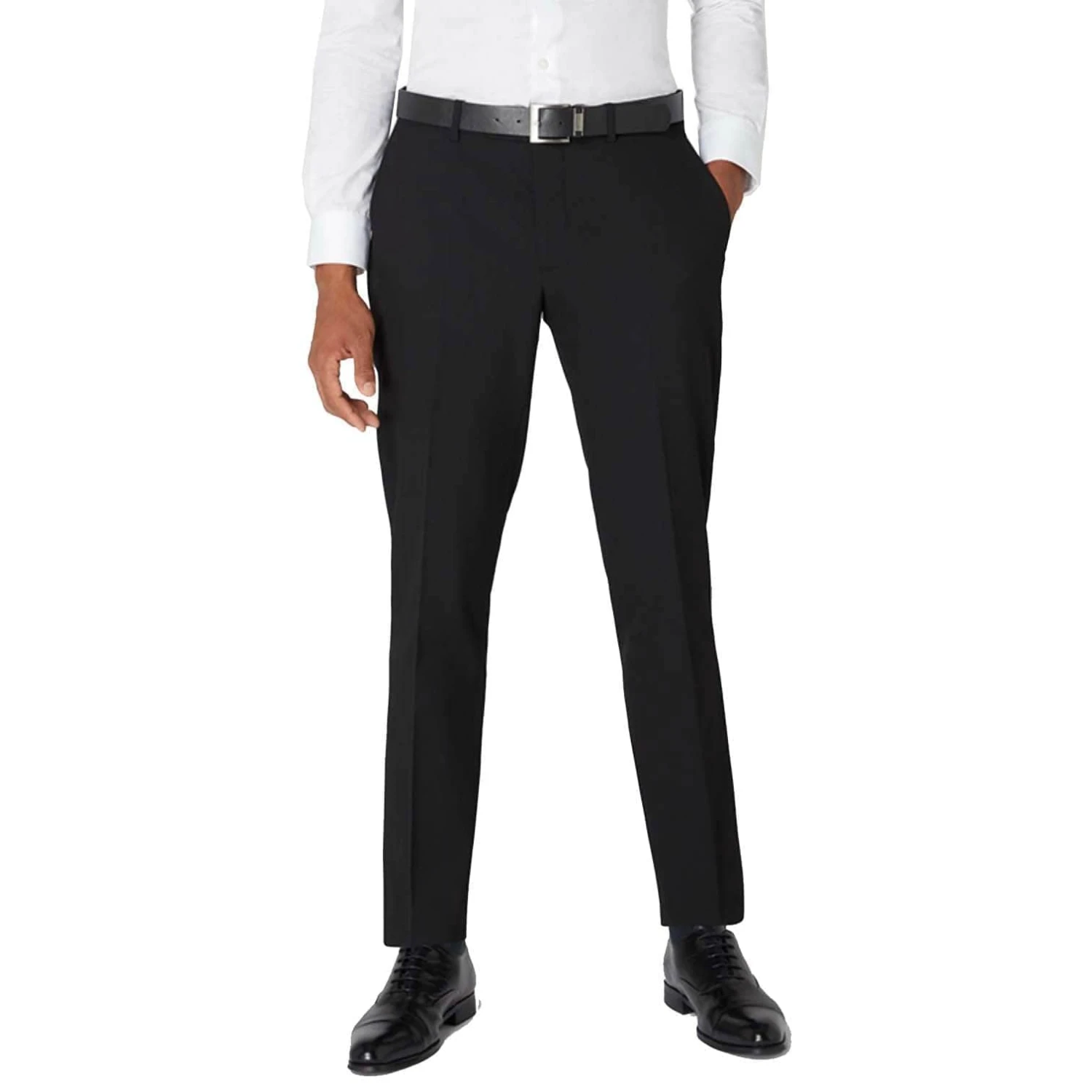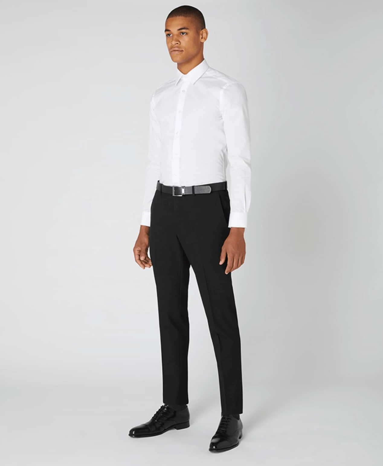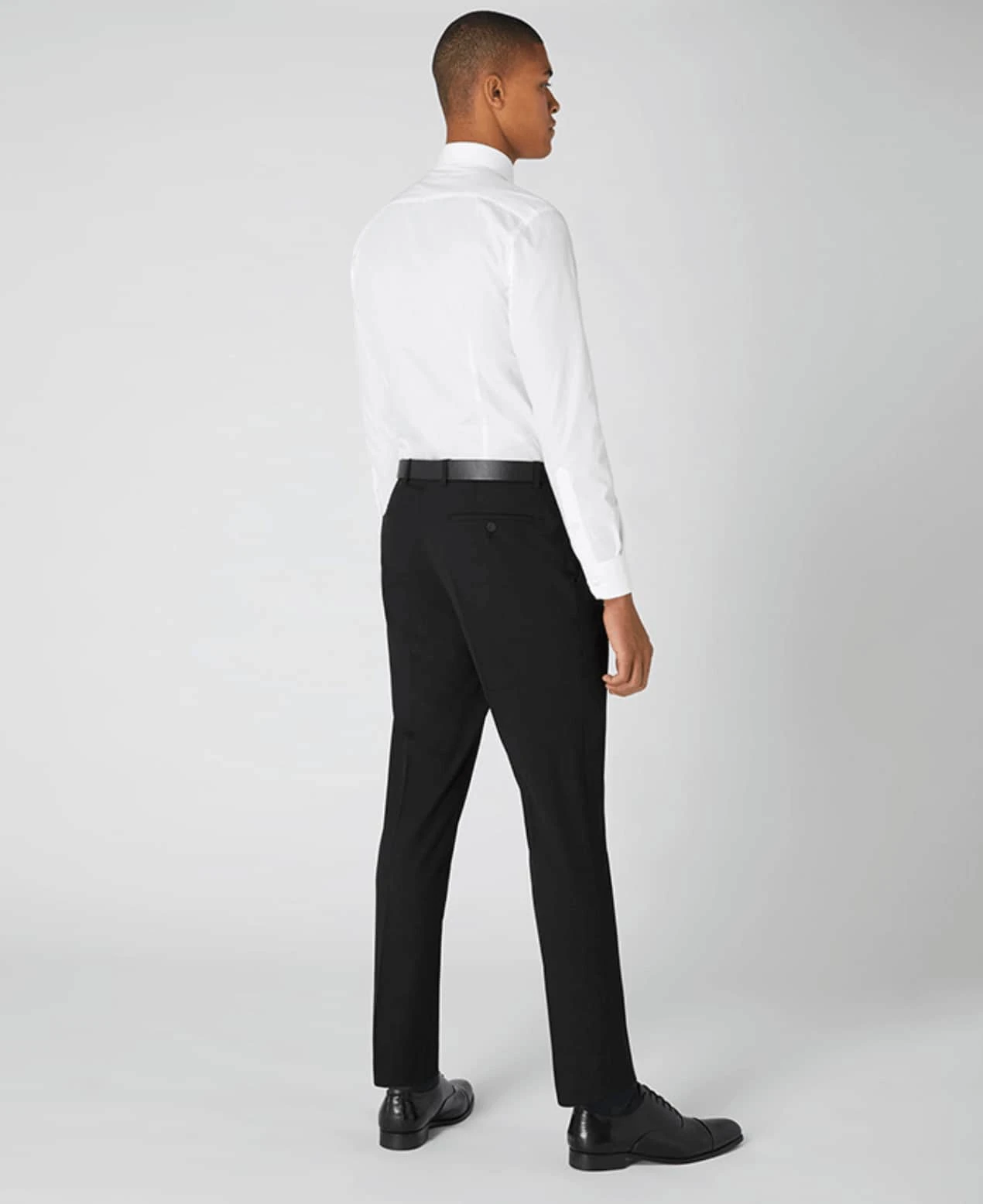 Black tapered fit formal trousers with stretch fabric and contrast stitch details.