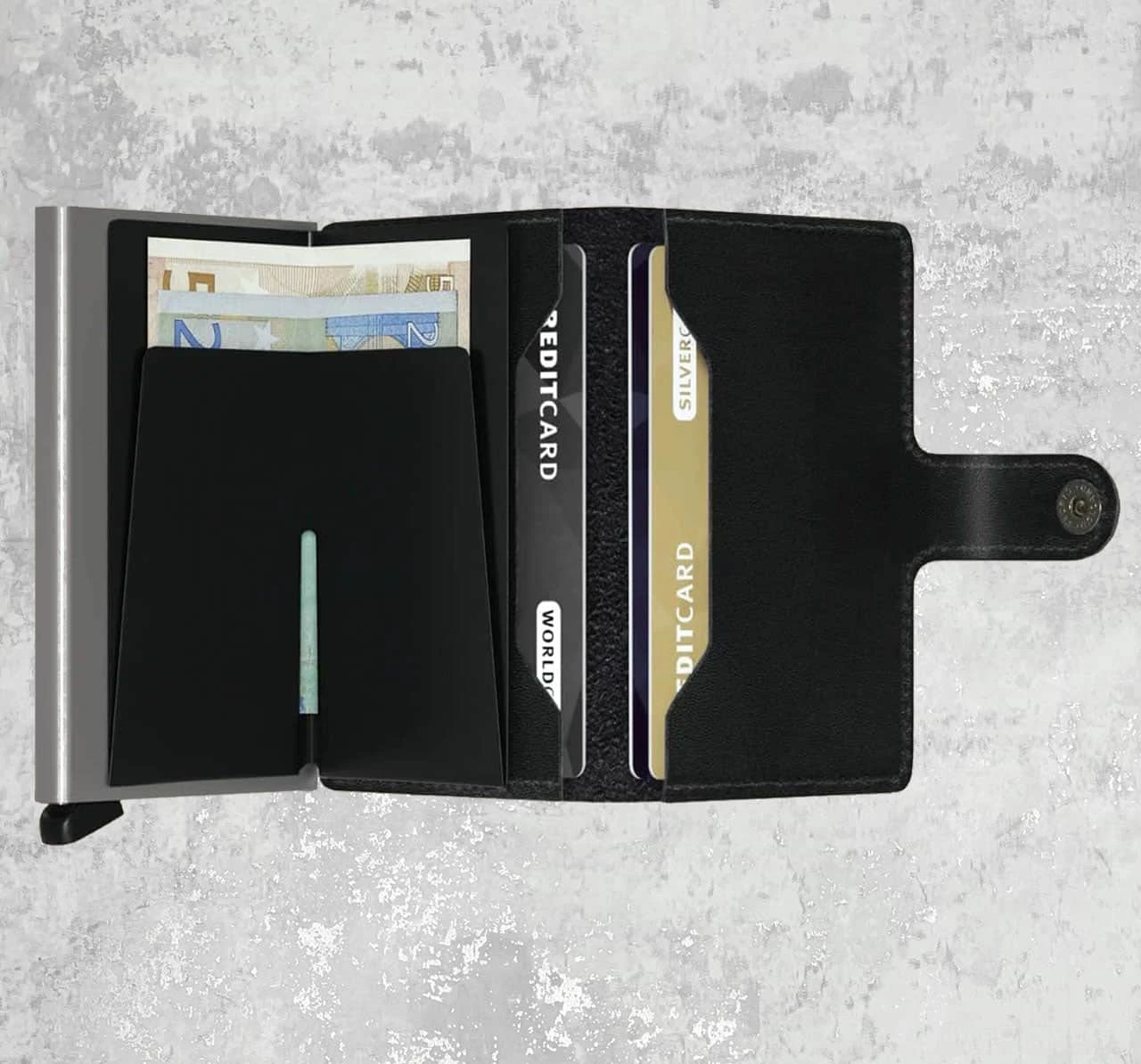 With the Miniwallet, you no longer have to compromise on space. The exterior is ingeniously designed to accommodate banknotes, receipts, and cards, ensuring you have everything you need at your fingertips. But that’s not all – the highlight of this remarkable wallet is the aluminum Cardprotector. With a simple motion, you can effortlessly slide out your cards, while the Cardprotector shields them from bending, breaking, and unwanted wireless communication.