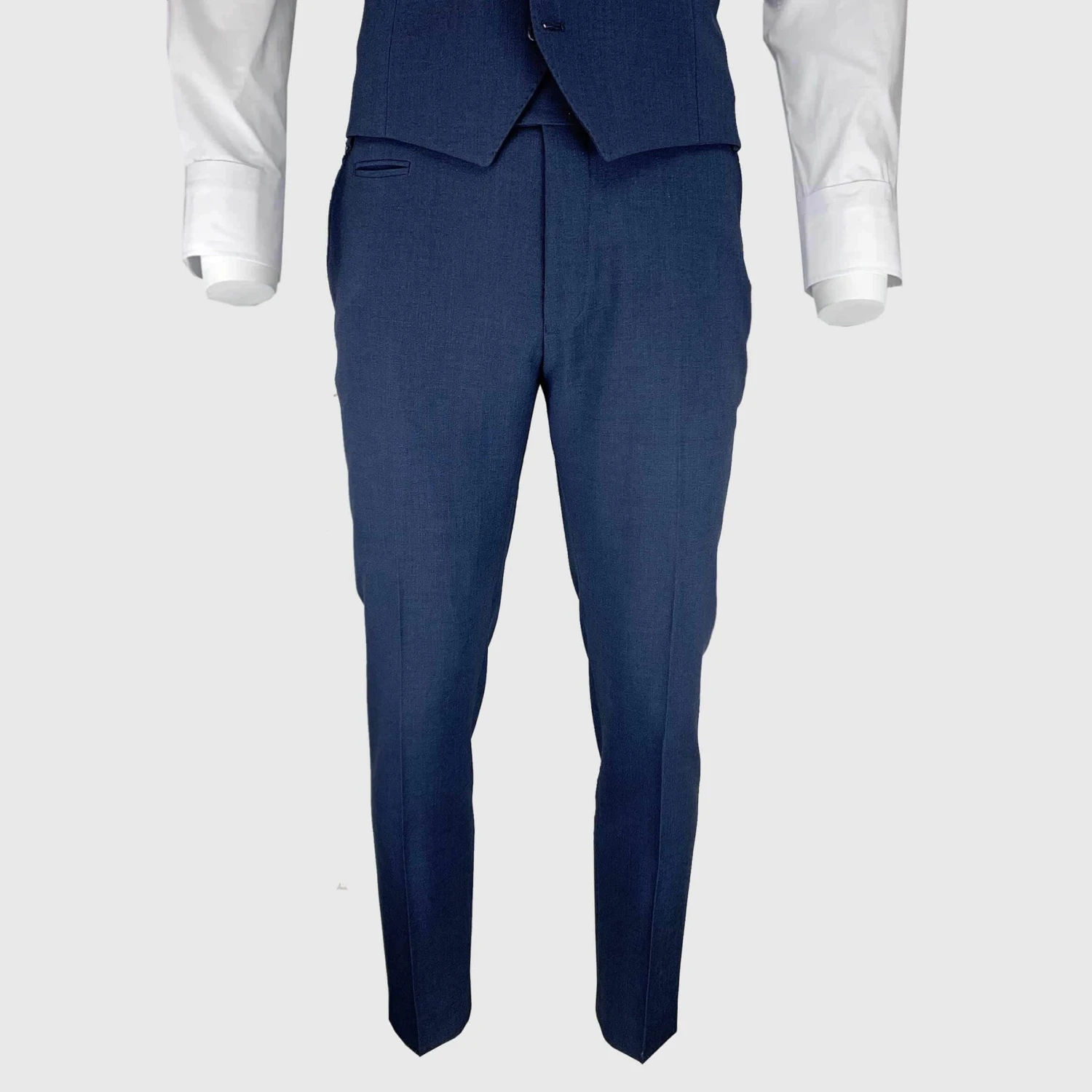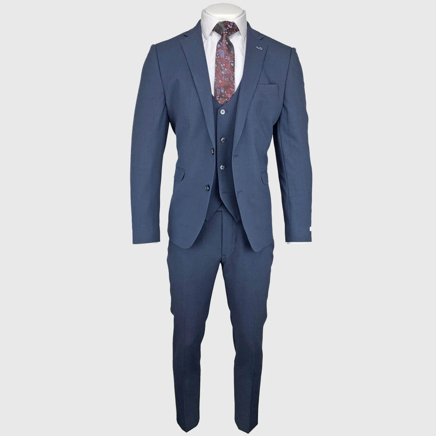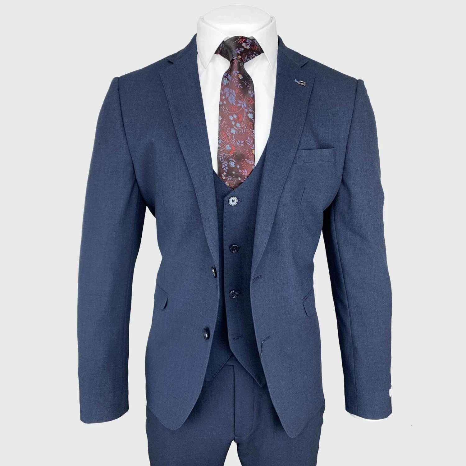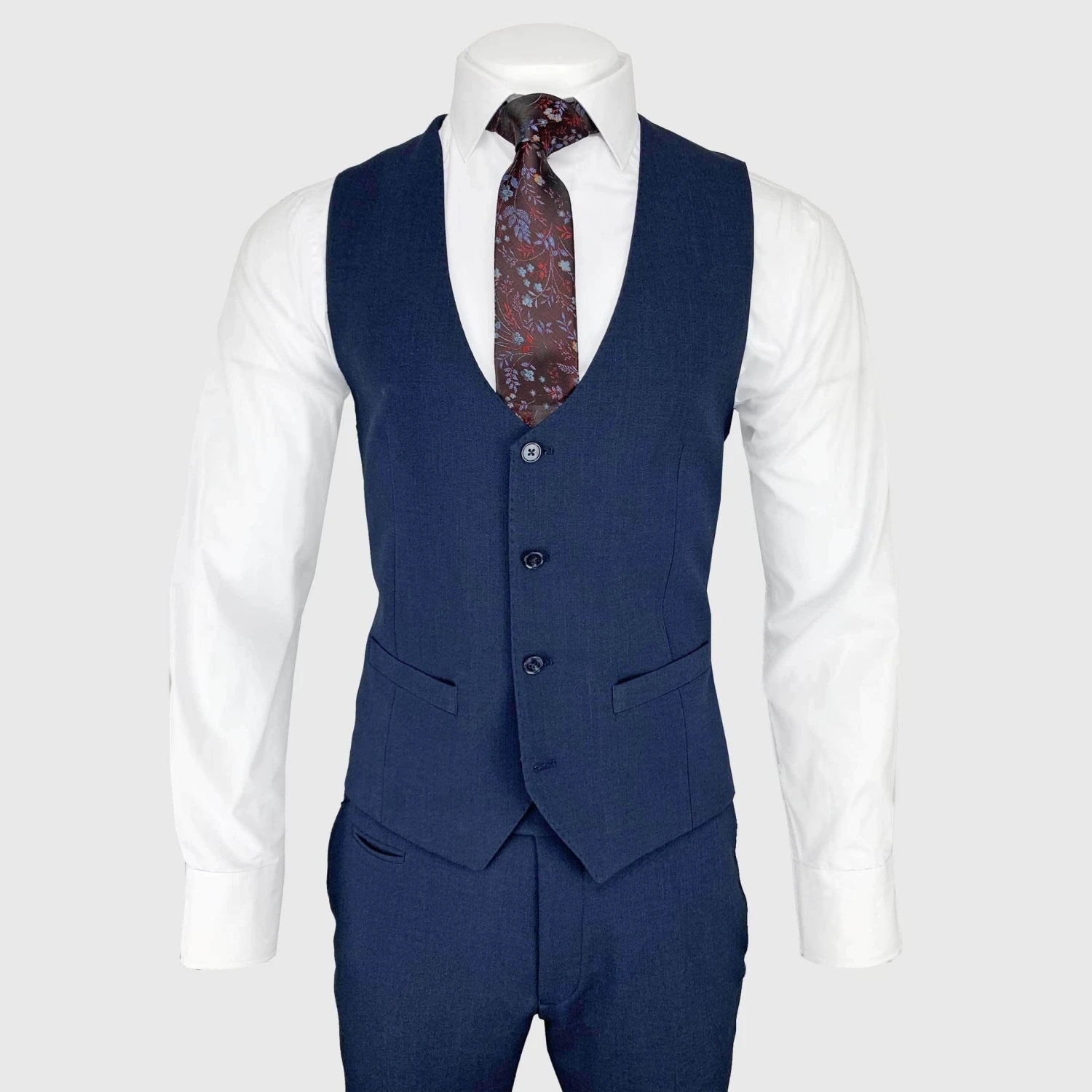 - White Label navy tapered fit 3pc suit. It features two button closure, flap pockets and two rear vents. Matching single breasted waistcoat with 4 button fastening and matching trousers. Stunning wedding or formal suit for variety of occasions.