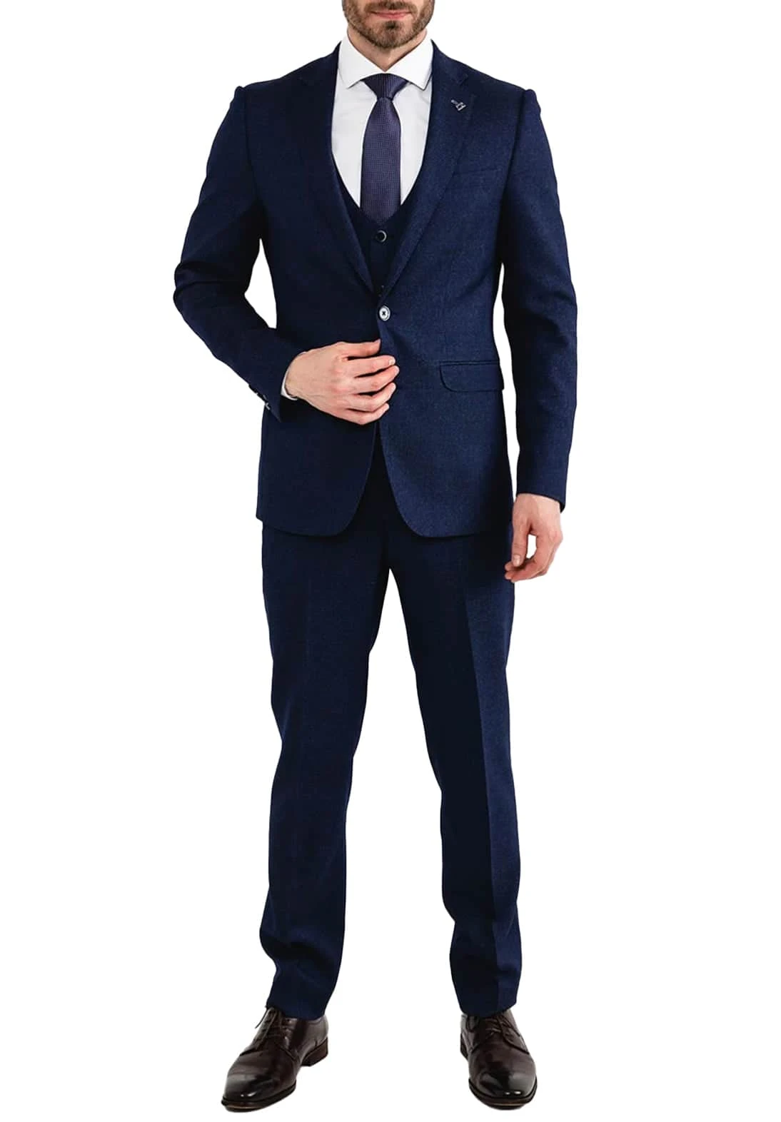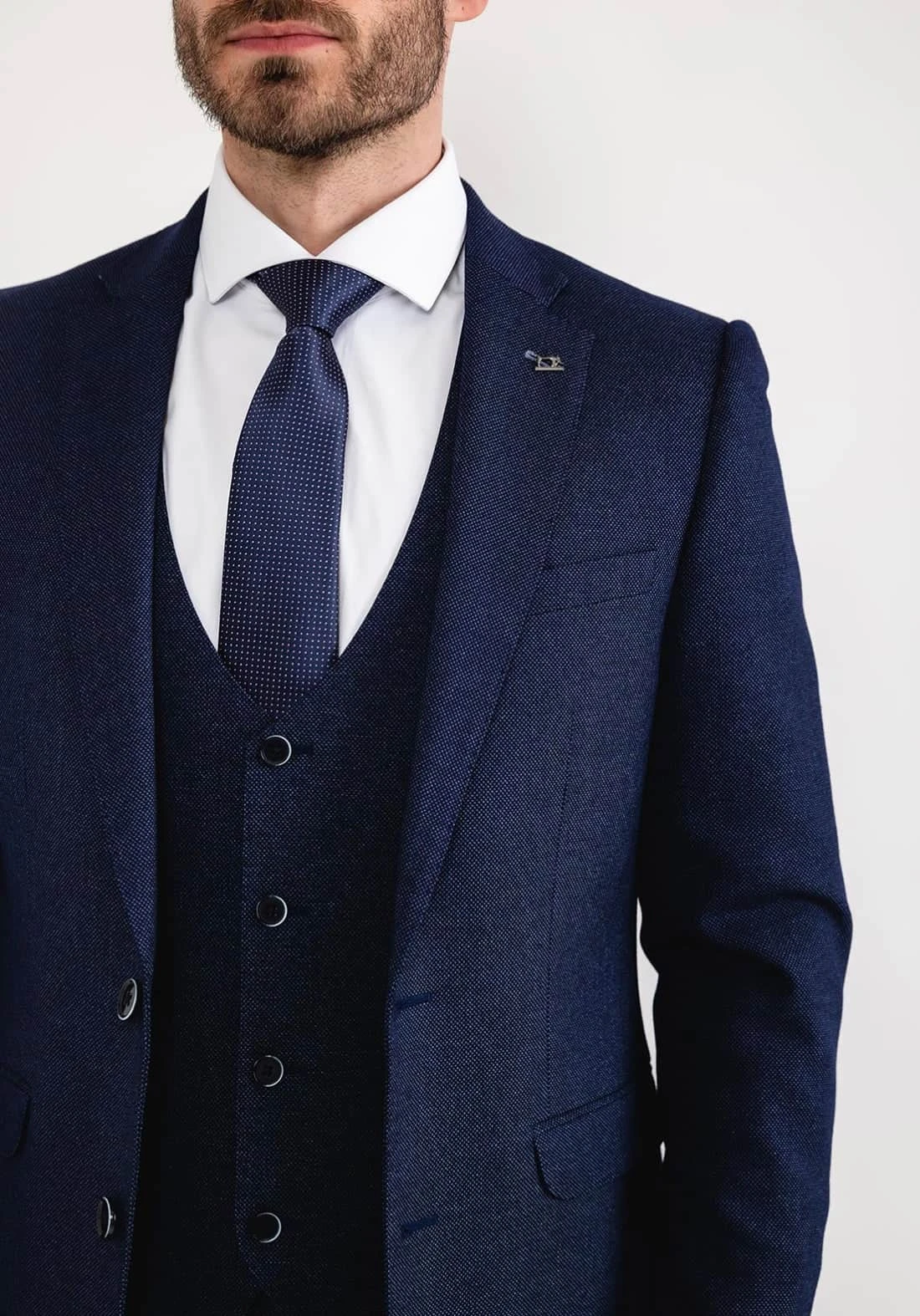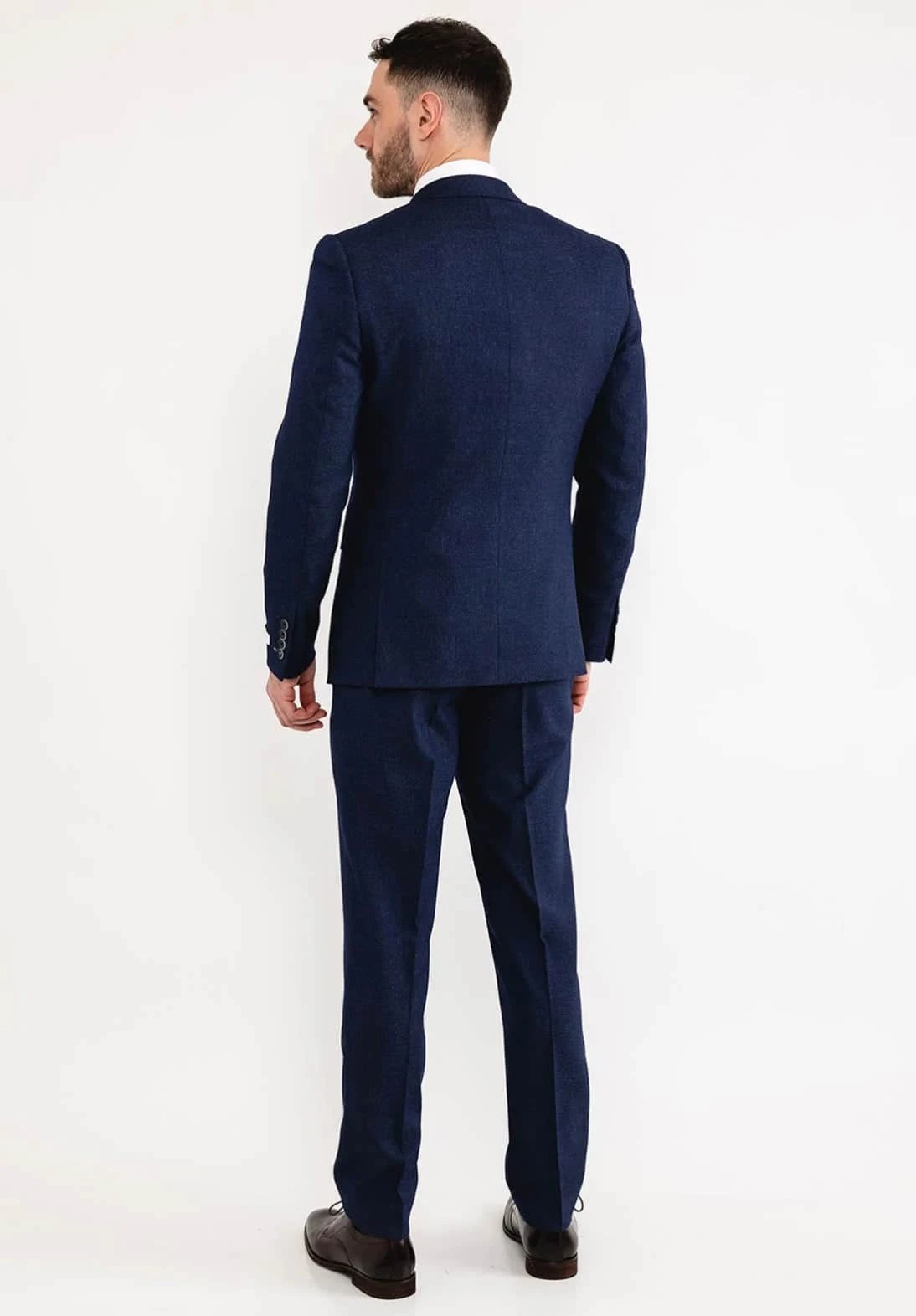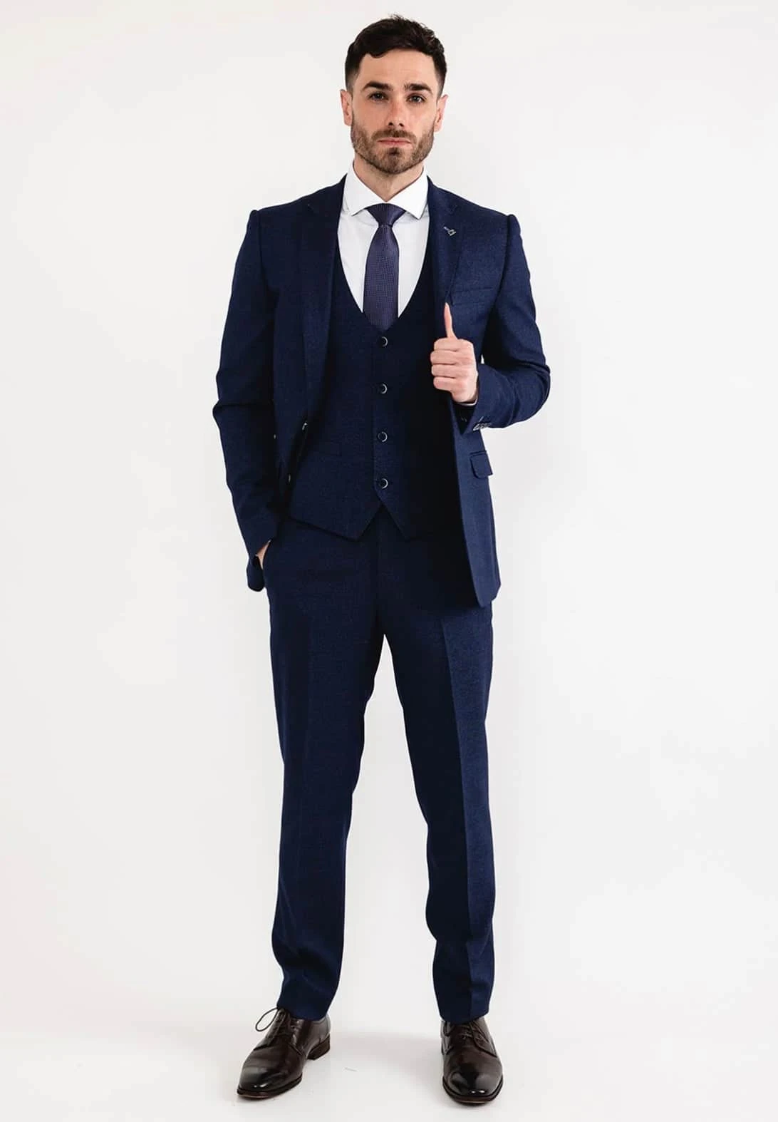 Introducing Style Code WBL84027-BLU in a classic Navy hue, this three-piece mix and match suit boasts a sophisticated tapered fit that exudes contemporary elegance. The distinctive birdseye pattern adds a touch of refinement, making it a standout ensemble for various occasions. The blazer and waistcoat feature a two-button closure with a single-breasted design and slim lapels, contributing to a sleek and modern aesthetic.