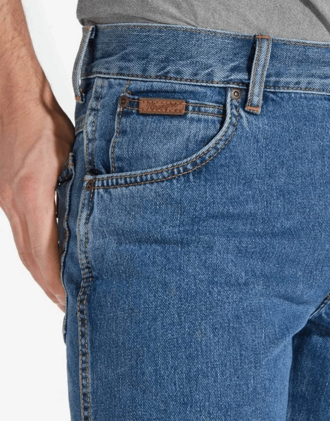 This particular pair of Wrangler Texas is a stonewash blue denim with no fading or creasing and is made from a 13oz denim. The Wrangler Texas features brown/orange stitching, giving a finish suitable for most occasions. These Wrangler Texas jeans bear a brown Wrangler leather patch on the rear pocket and have the signature “W” Wrangler stitching on both of the back pockets. The Wrangler Texas jeans were originally designed for workmen, so staying true to their heritage, these jeans are very durable.
