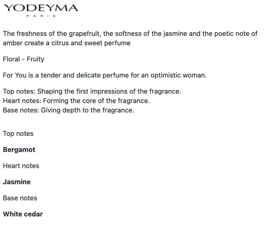 Yodeyma fragrances are meticulously crafted to offer an exquisite alternative to renowned brands, providing exceptional quality and sophistication. Immerse yourself in the captivating world of For You, a fragrance that celebrates the beauty and optimism within every woman.